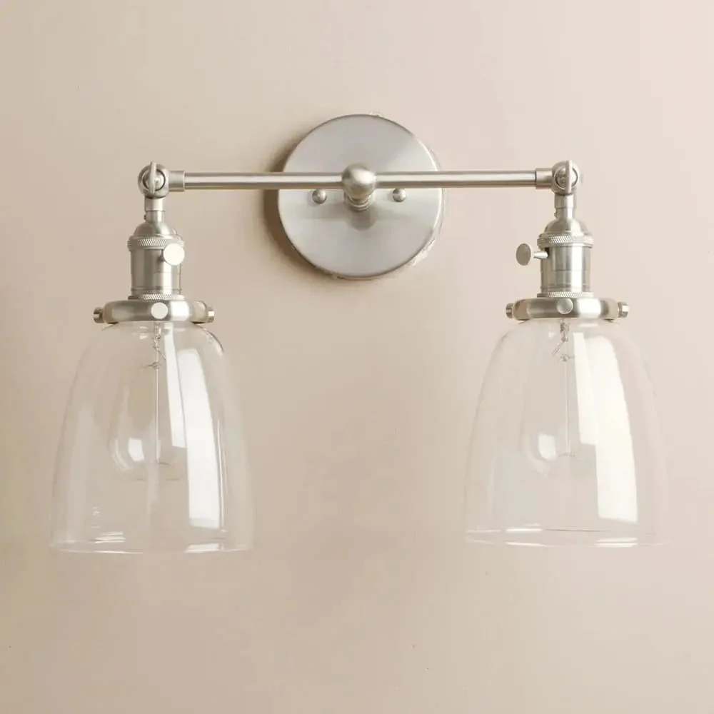 Decorate and light your home with this stunning minimalist 2 Lights Industrial Wall Sconce! The 2 lights configuration ensures ample illumination, ideal for brightening up hallways, bathrooms, or entryways. Each light is encased in a clear glass shade, which not only enhances the overall design but also allows the bulb’s warm glow to shine through, creating a cozy and inviting atmosphere.