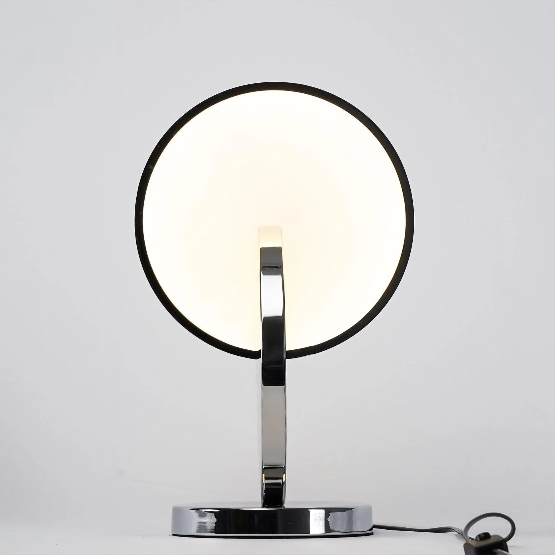 The Eclipse table lamp has a sculptural silhouette with a mobile-like quality that changes at every angle. The chrome and acrylic disc supported by a mirror-polished base can be rotated ninety degrees to adjust the angle of light diffusion and reveal a variety of silhouettes.