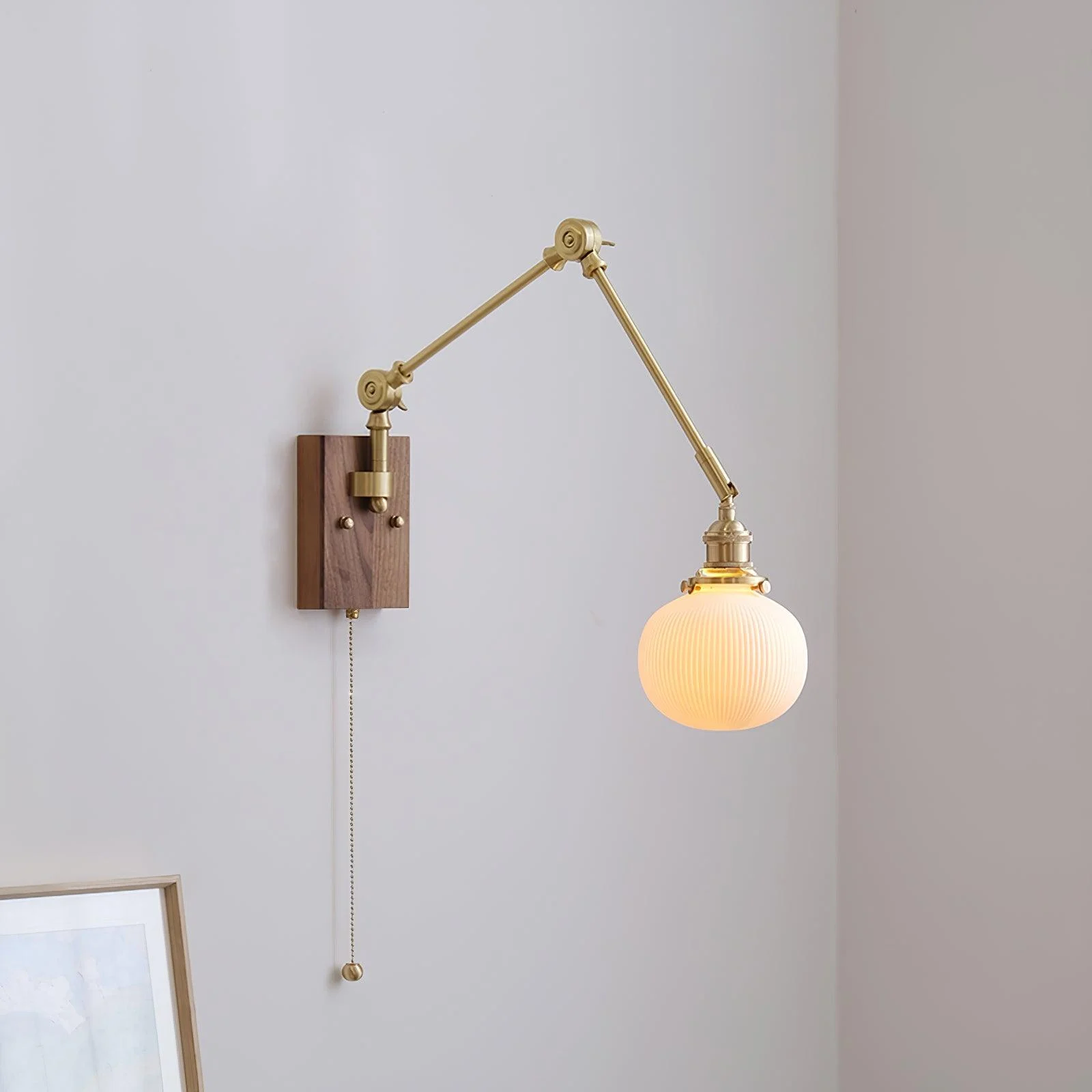 This sleek and sophisticated lighting fixture combines a wooden walnut wall plate with a chic ceramic lampshade, seamlessly blending modern elements with timeless style. The result is a perfect fusion of refinement and classic design, adding a touch of elegance to your space. Illuminate your surroundings with the unparalleled charm and versatility of the Elia Swing Arm Wall Lamp.