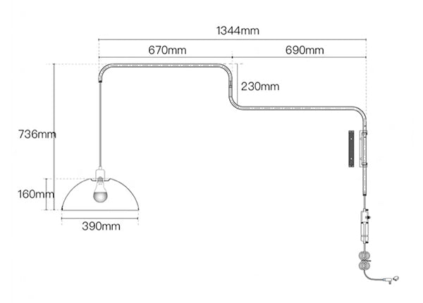 The lamp has a swiveling, fully adjustable stem. The 40 cm diameter shade is height adjustable with a black metal counterweight with integrated light switch. It has a large reach and could very well double as table and reading lamp in an small apartment or (home) office.