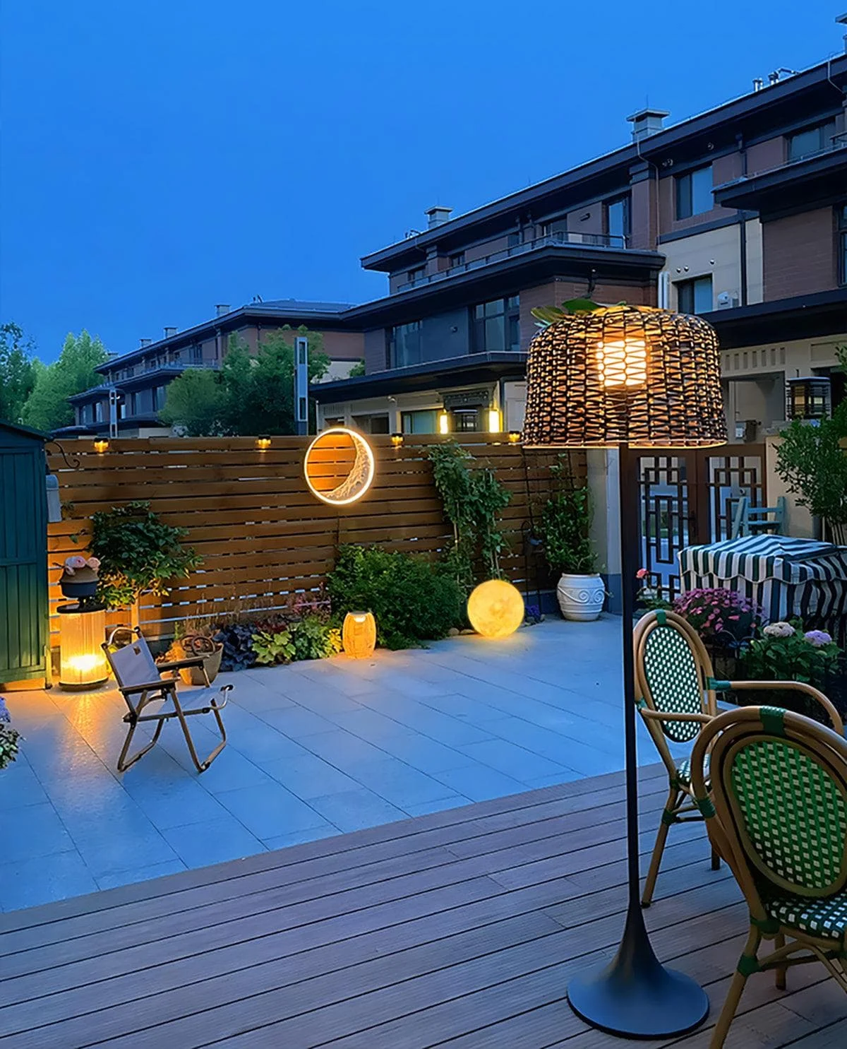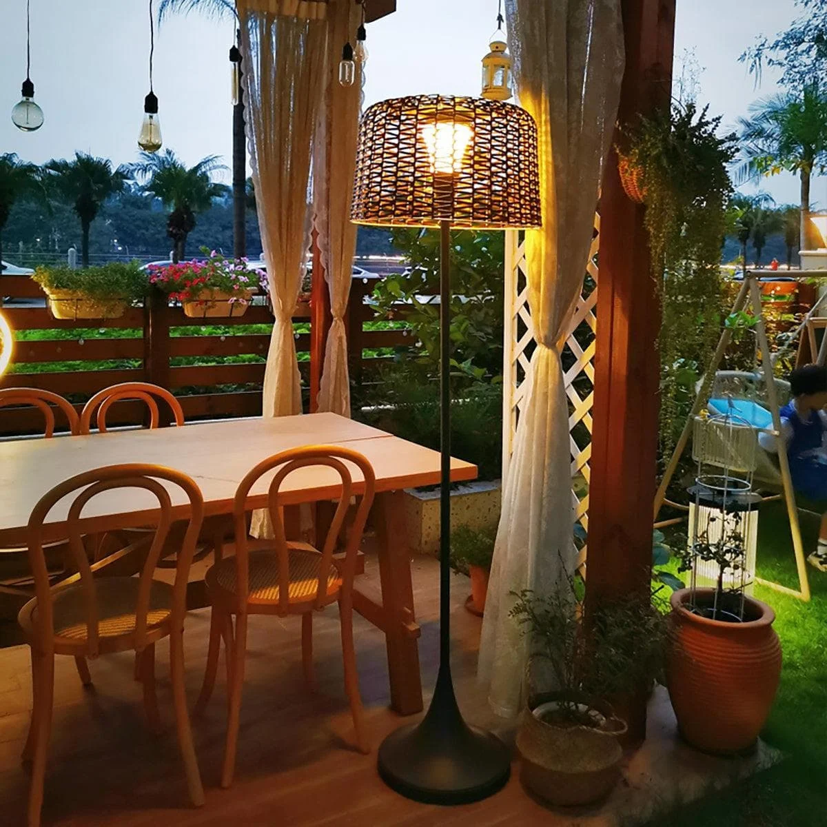 Add a warm glow to your outdoor living space with the nautically-inspired Environmental high network Floor Lamp. This lamp features a natural finish teak & powder coated aluminum frame. The lamp shade is made from taupe woven all-weather wicker that is weather-resistant.