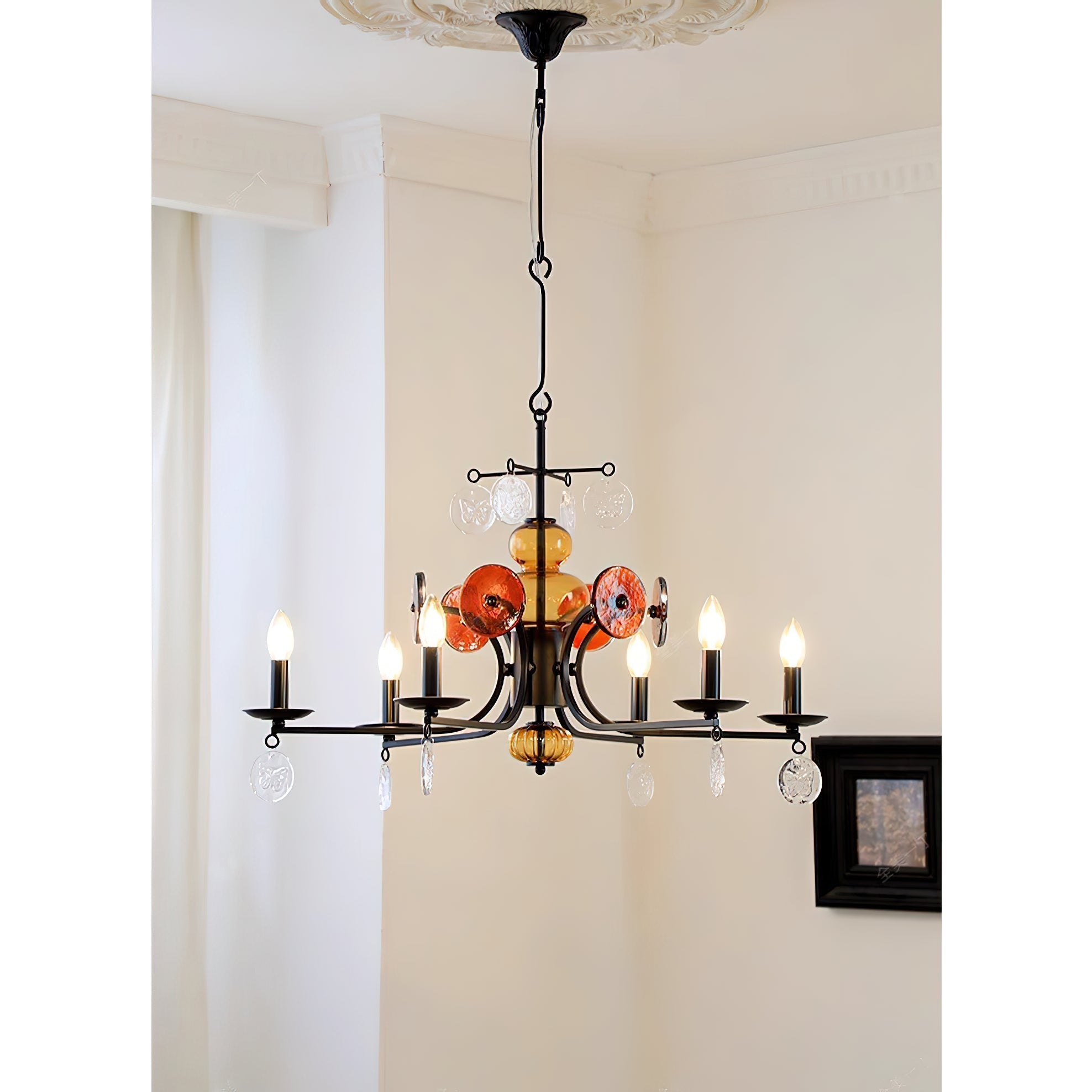Expertly crafted by renowned glass artist, this chandelier is a stunning fusion of blown glass and wrought iron. With four original drop down extensions, it showcases the artist’s signature style in rich colors of amber, red, and clear glass. Elevate your space with this exceptional and timeless design.