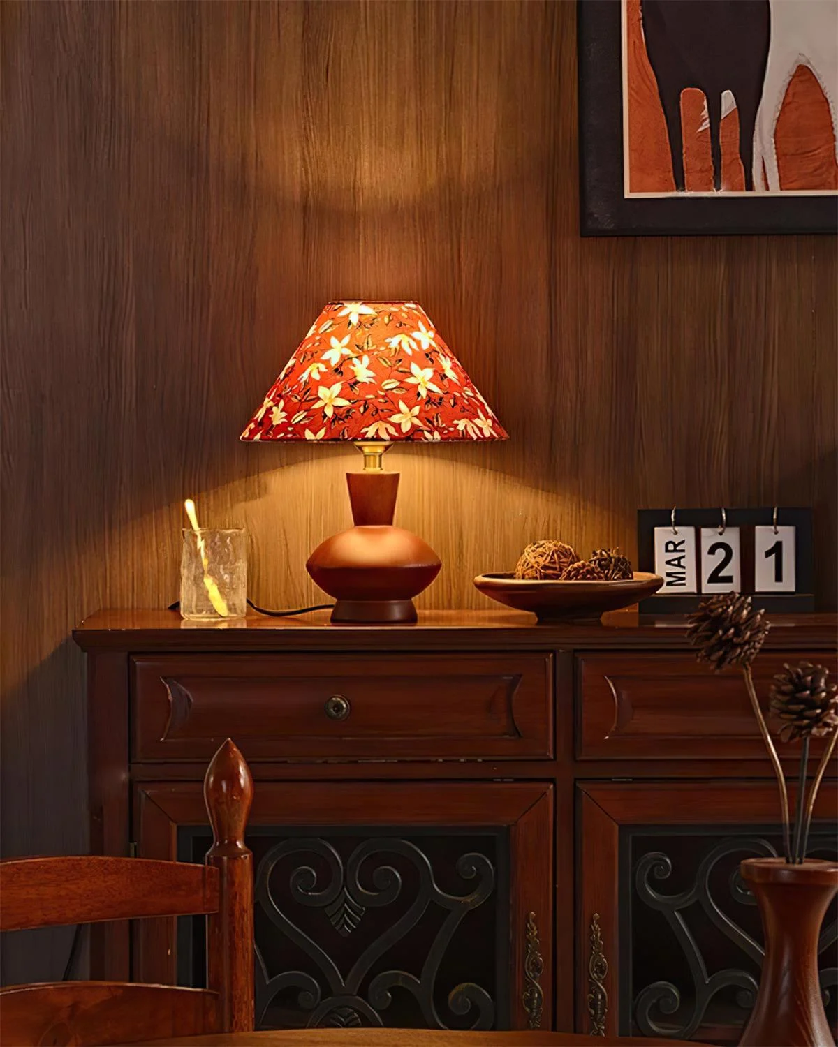 The Evie Table Lamp combines classic elegance with modern design. Its beautifully crafted wooden base complements a stylish, patterned fabric shade that adds a soft, warm glow to any room. The contrasting texture of the wood and the intricate floral or red patterns on the lampshade make this piece a striking addition to both contemporary and traditional interiors. With its versatile design, the Evie Table Lamp serves as both a functional light source and a decorative accent, perfect for bedside tables, desks, or living spaces.