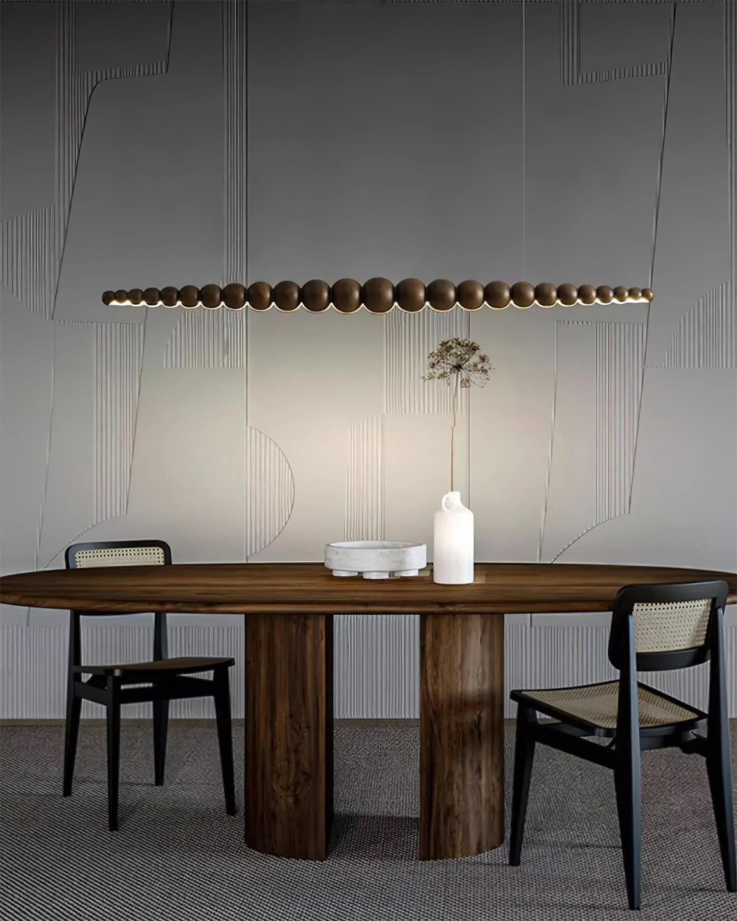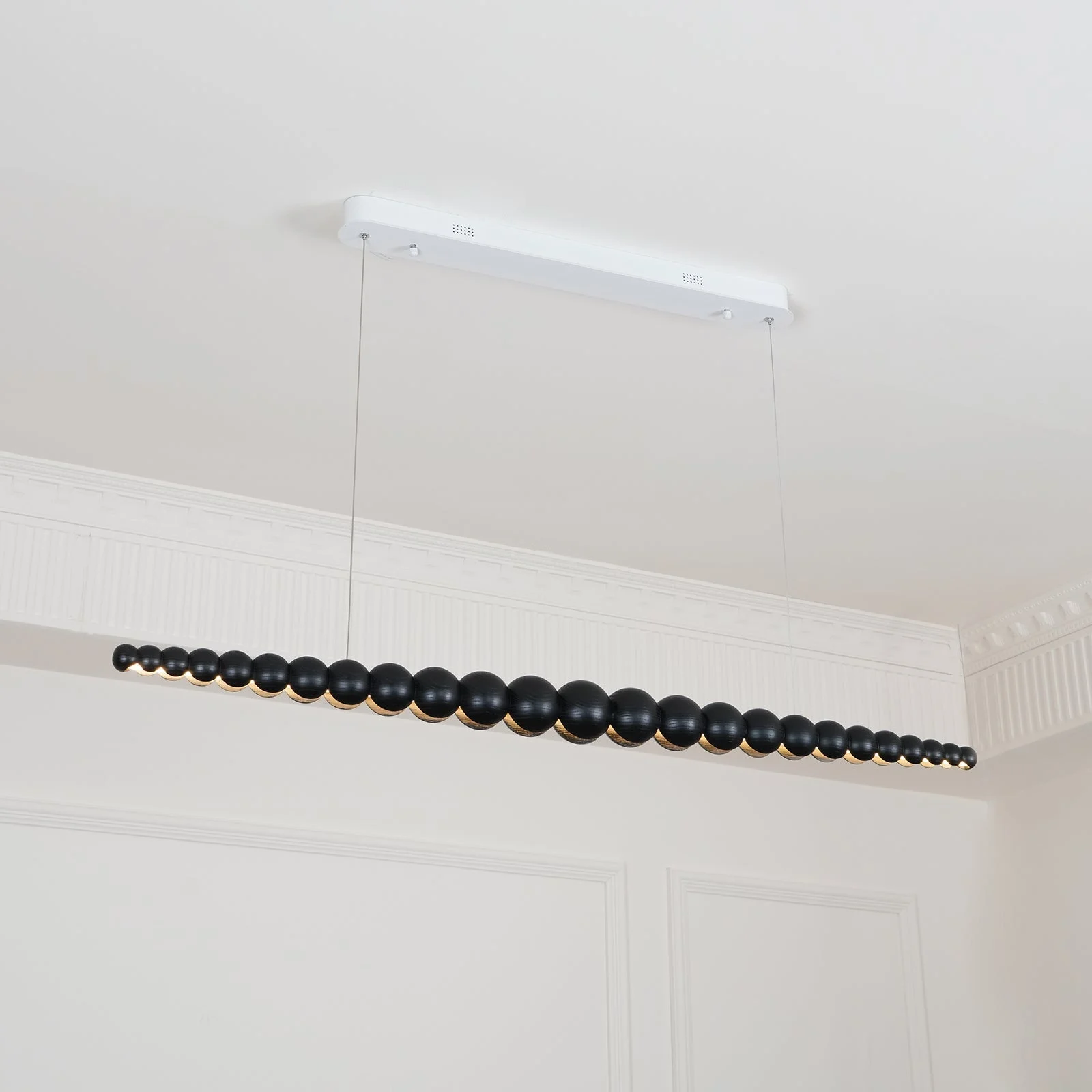 The Filamento Chandelier showcases a captivating fusion of geometric simplicity and elegant lighting. This contemporary piece features an array of spherical bulbs perfectly aligned in a linear formation, suspended by slender cables that enhance its aerial elegance. Each bulb emits a warm, soft glow, creating an inviting ambiance suitable for both intimate gatherings and professional settings. Available in three chic finishes—matte black, rich walnut, and a neutral tone—this chandelier complements any modern decor with its bold yet unobtrusive presence.