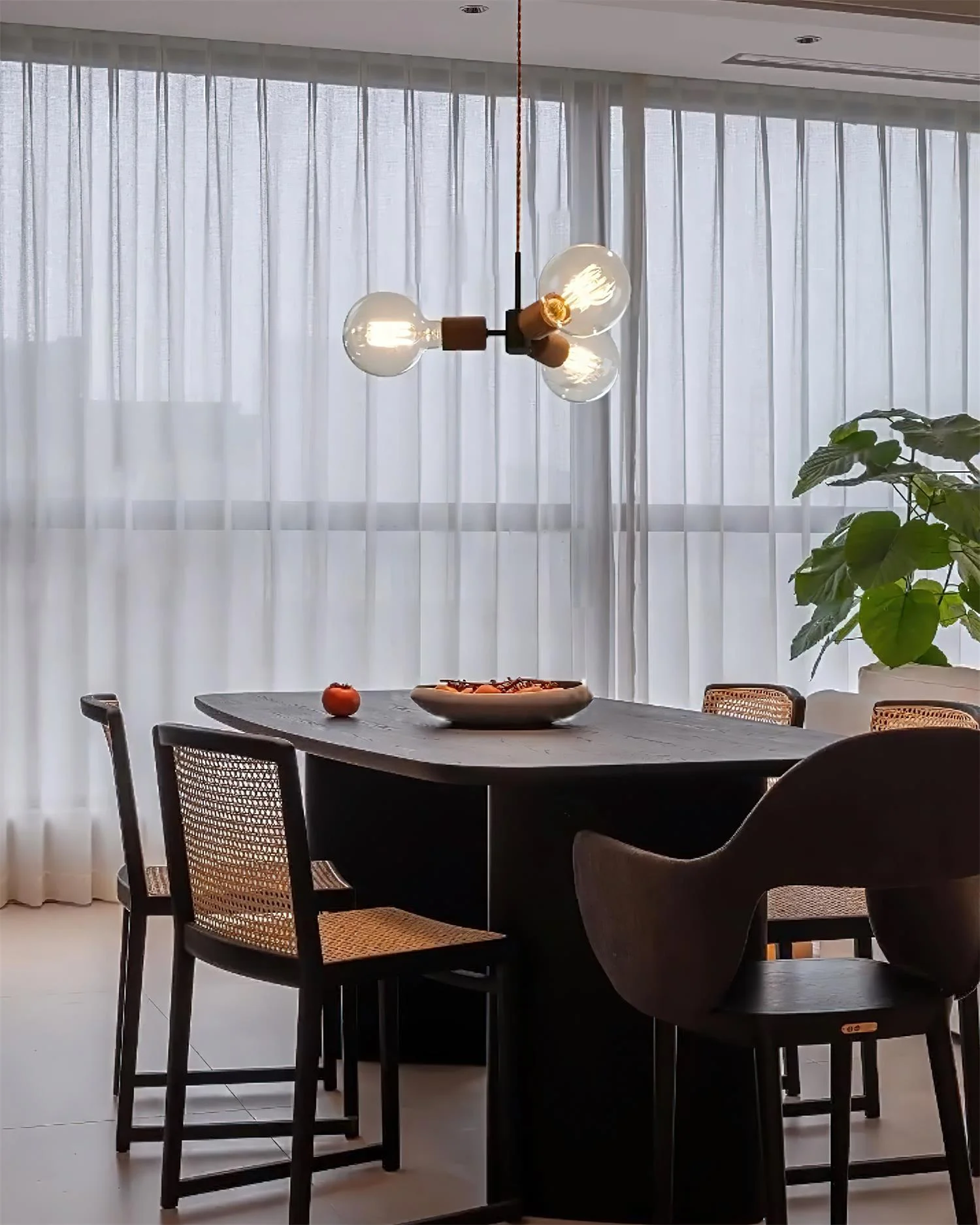 The Filotto Pendant Lamp from Docos, a bold statement of industrial elegance. This minimalist chandelier features three exposed bulb fixtures, each connected by sleek wooden accents, bringing warmth and an organic touch to the design. The clear glass bulbs enhance its raw, modern aesthetic while providing ample illumination, making it perfect for contemporary and loft-style interiors.