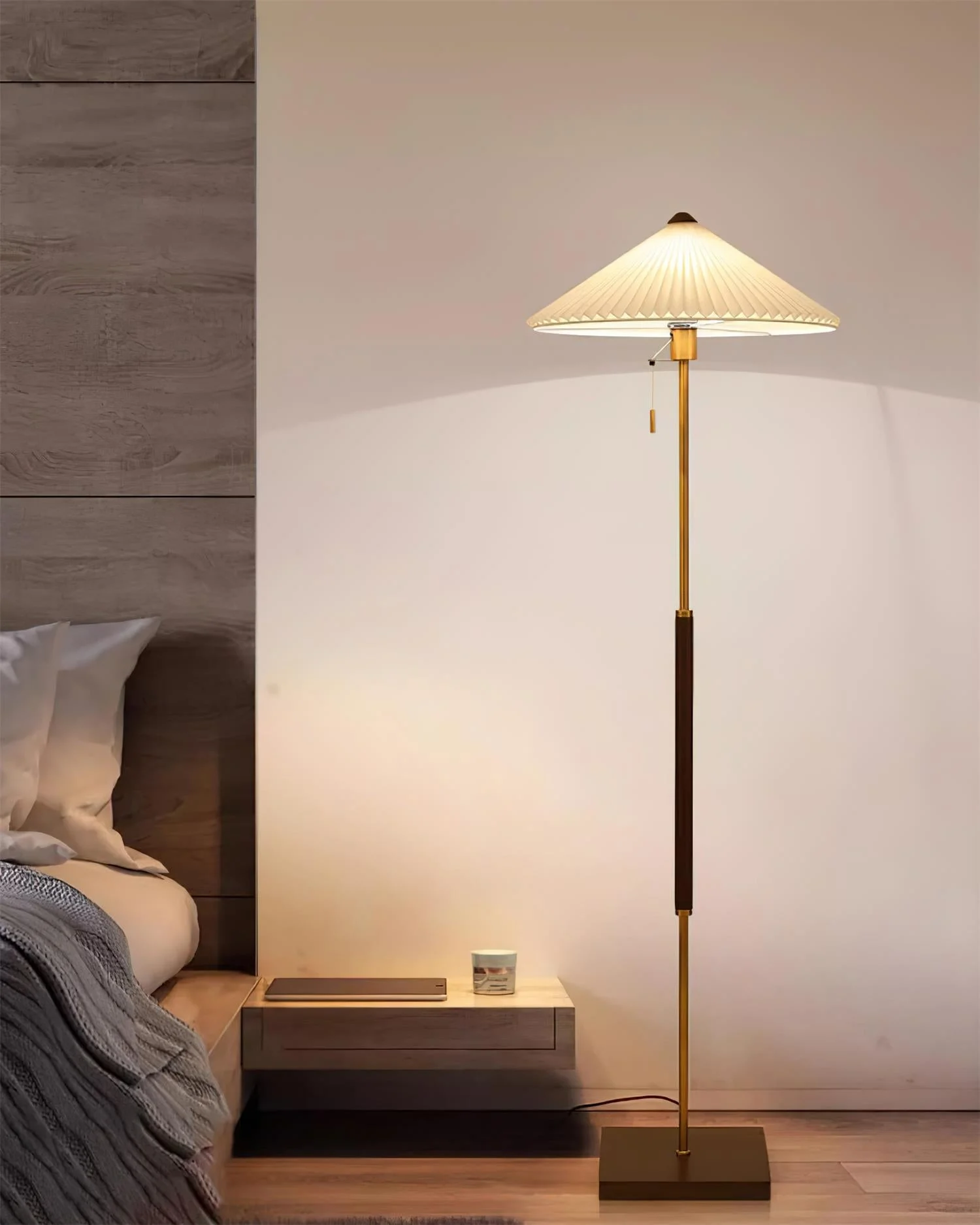 This Flores Floor Lamp showcases a pleated, conical shade that exudes a minimalist charm while diffusing light in a soft, inviting glow. The slender Metal and Walnut Wood stand gives it a sculptural, elevated look, bringing a timeless appeal to any interior. Designed with a sleek pull-chain detail, this floor lamp embodies sophistication and functionality in one elegant form.