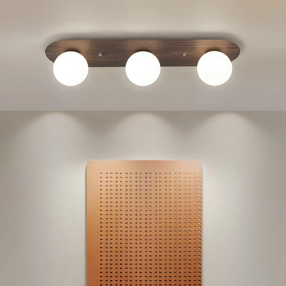 - The modern ceiling light features a sleek flush mounted wood board and stylish globe glass bulbs that complements a variety of interior decor themes. The walnut-colored fixture adds a touch of warmth and sophistication to any room. The thickened, milky white glass shades ensure even light distribution and create a soft, ambient glow that enhances the atmosphere of any room. Available in 2, 3, or 4 lights to suit different illumination needs.