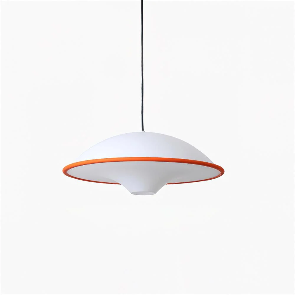 This Fontana Pendant Lamp with its sleek, UFO-like silhouette, is a modern take on minimalist design. The smooth, expansive surface of the lampshade is crafted to not only look aesthetically pleasing but to also cast a soft, diffuse light that envelops the room in a warm, inviting glow. The bold black trim adds a striking contrast, enhancing the visual impact and drawing the eye upward.