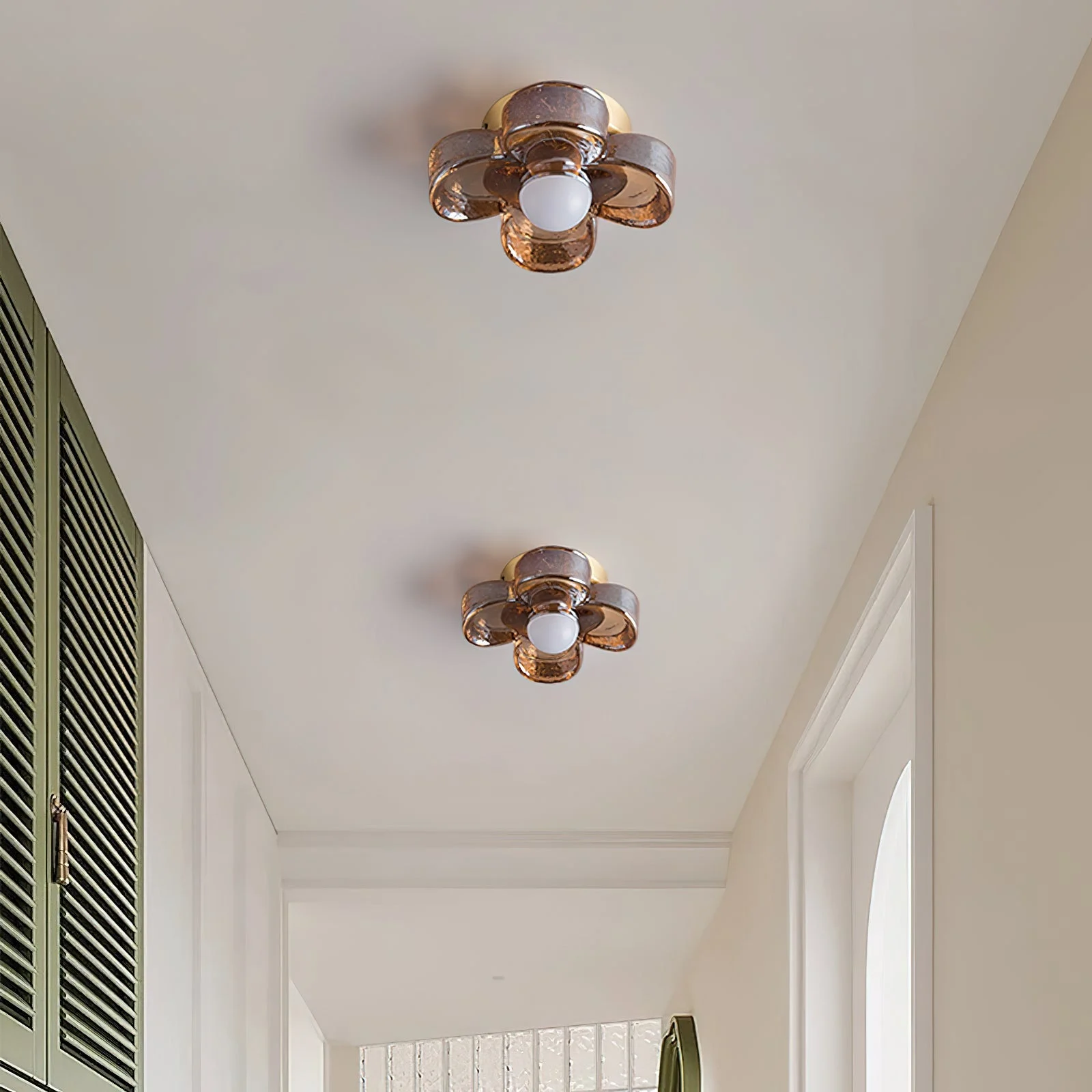 The Four Leaf Clover Ceiling Lamp from Docos is a masterpiece of modern design and elegance. Featuring flower-shaped, hand-blown glass shades with a rich amber hue, this light creates a captivating glow and adds a luxurious touch to any room. The combination of premium glass and a polished brass base ensures durability and timeless sophistication.