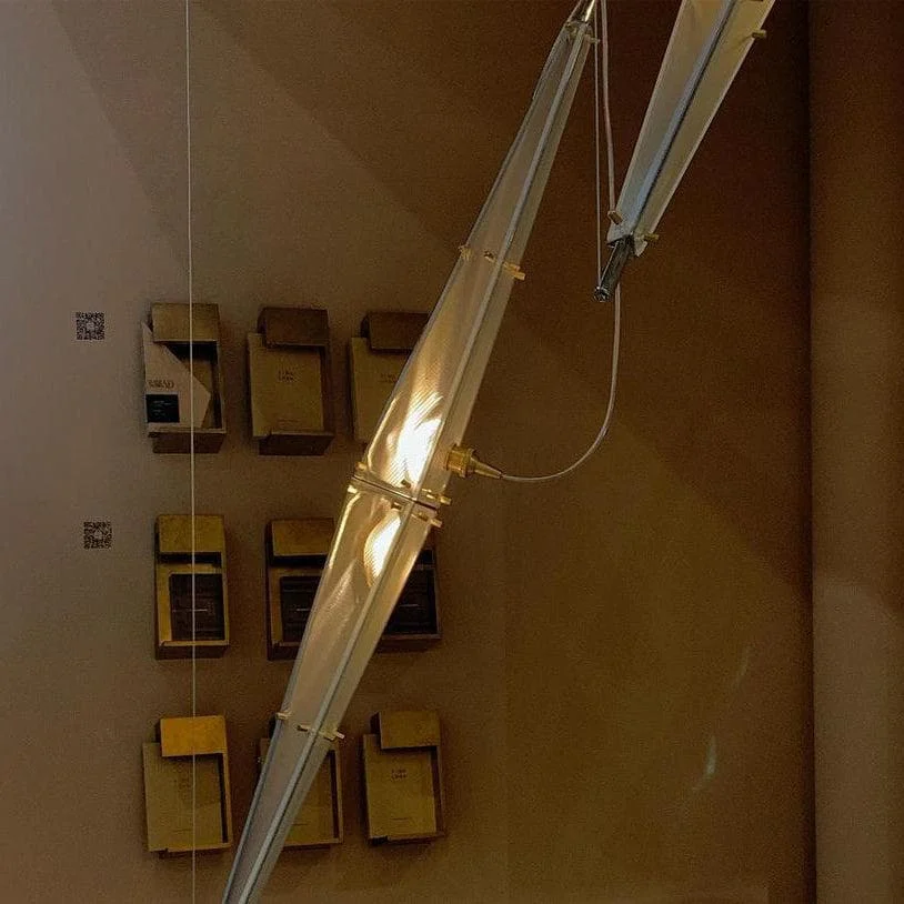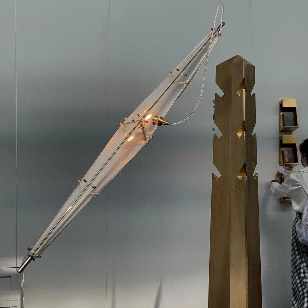 To explore the linkage between the dassical and modern, was inspired from cutting arch sense of future and arch cutting as the floor plan of the product, use stainless steel to fold it into extremely long cone with tension, glass used the soft texture of the materal, through excusite cutting fixed on to the stainess steel frame, deiberately exposed lamp holder, screw and wire directly fixed on the glass, build a kind of delicate and violent conflict.