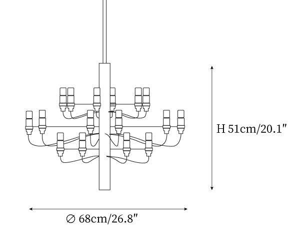 Since 1958, this iconic 2097 Suspension Lamp design has served as an ultra-modern representation of the traditional mid-century chandelier. Every detail of this state-of-the-art ceiling light is exceptional, from the mirror-polish finish of its main steel structure to the way each bulb is fitted with its own horizontal arm and the graceful wiring meanders down the stem.