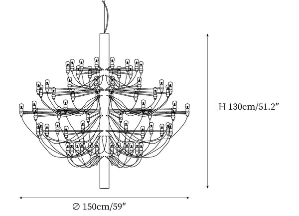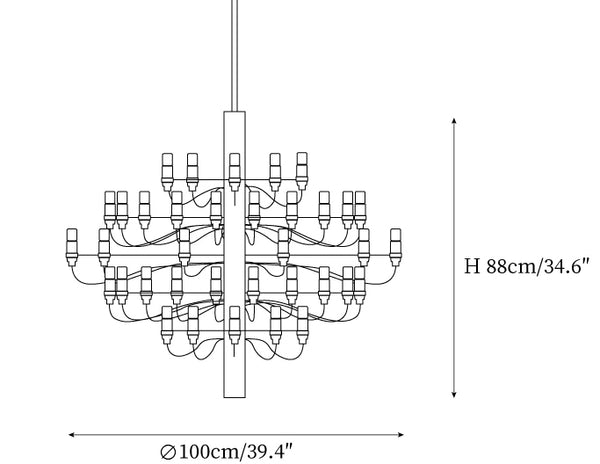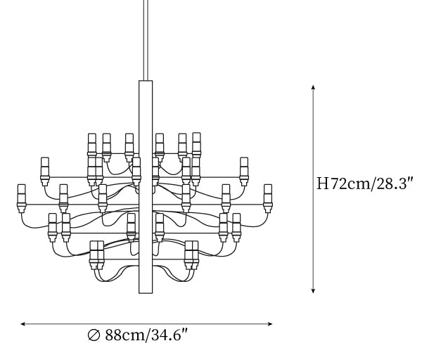2097 Suspension Lamp holds 18, 30, or 50 incandescent bulbs, Suspension lamp provides diffused light. Steel central structure with brass arms, both available either chromium-plated, black, or golded. Steel ceiling fitting.