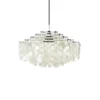 The high-gloss chrome-plated frame of the FUN shell pendant Lamp has metal rings of different sizes, increasing from top to bottom. Shell disc chains of different lengths are hung on these rings. FUN Shell Pendant Lamp, The translucent surface of the shell disc acts as a light filter and reflection. The ceiling and walls are bathed in an interesting game of light and shadow.