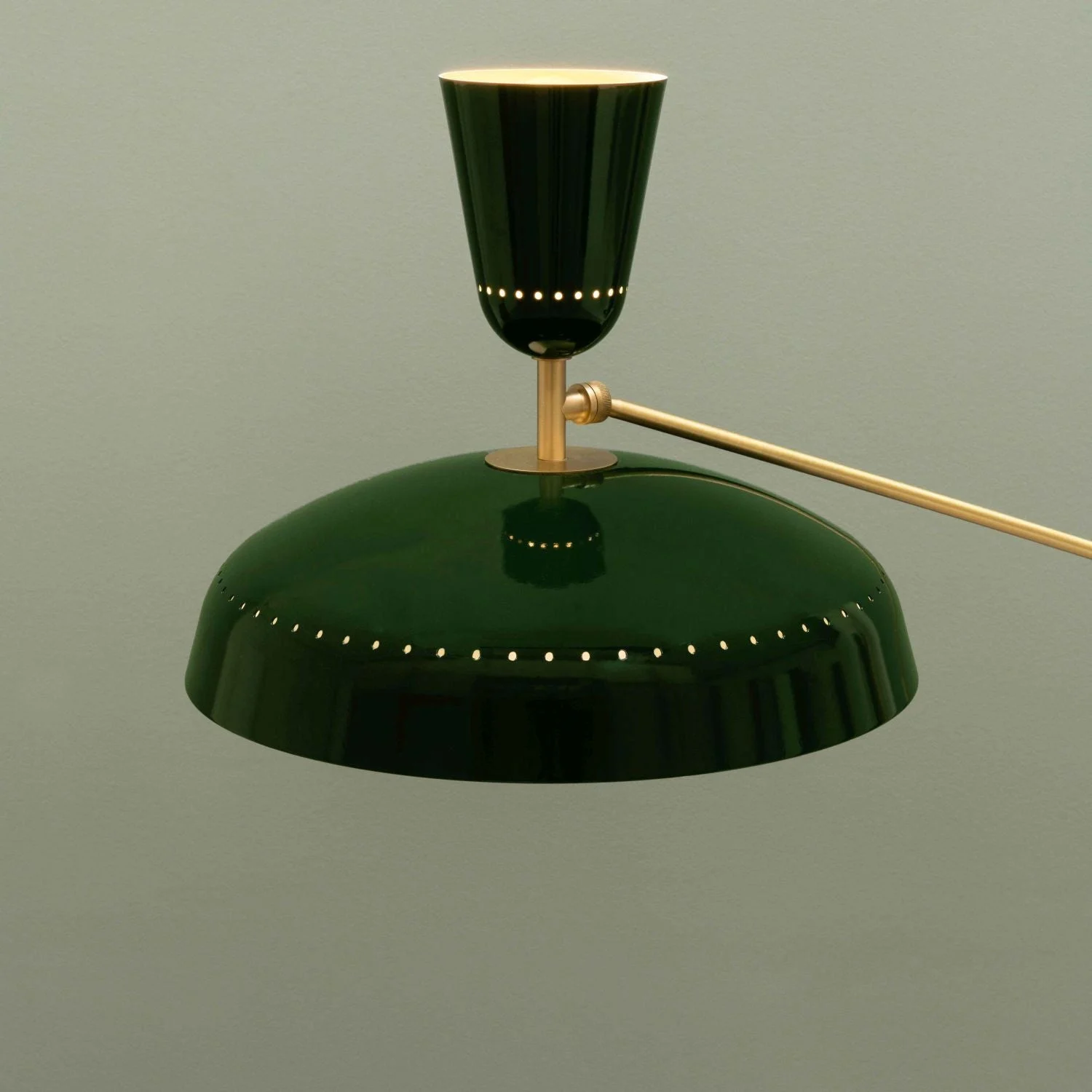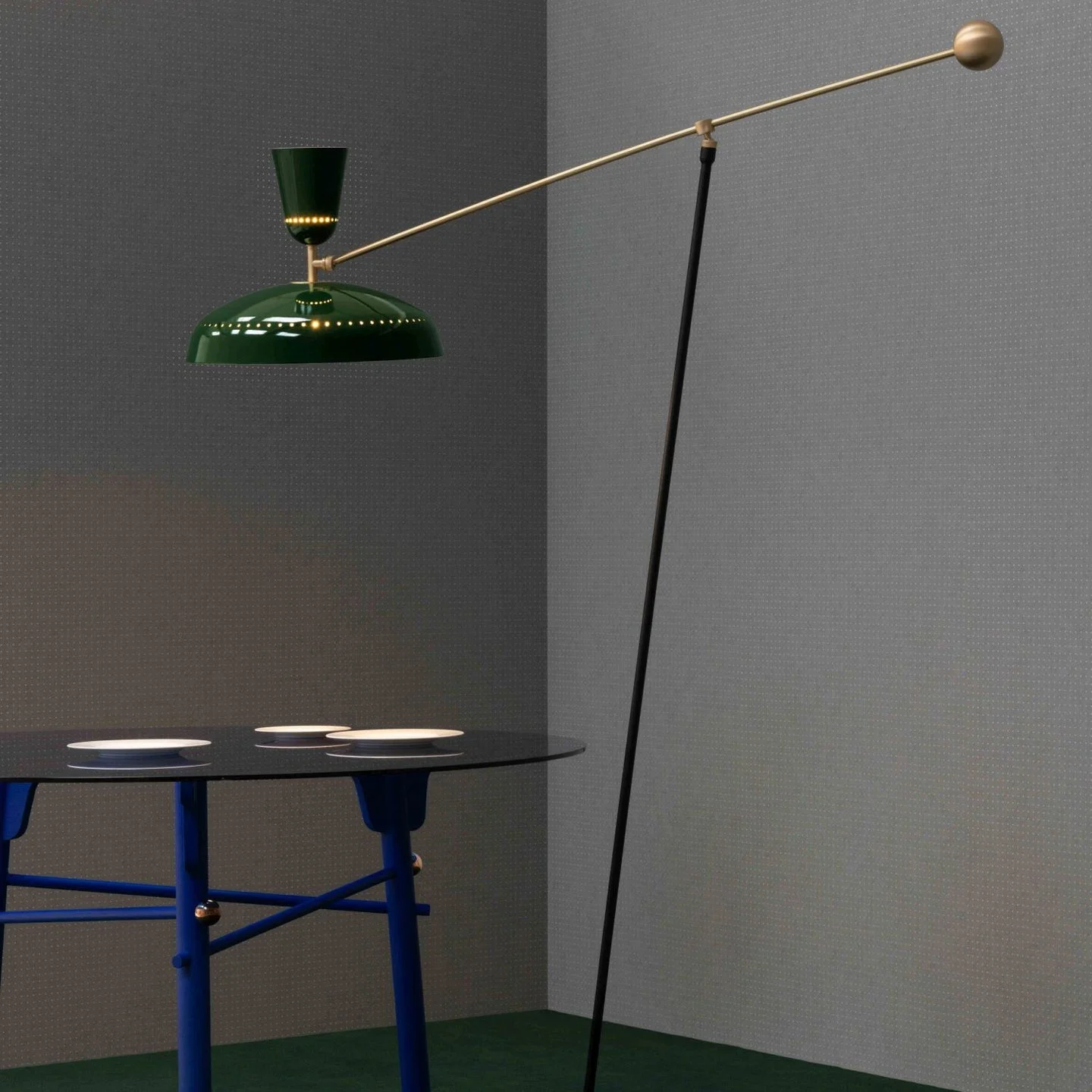 Elevate your interior with the G1 Floor Lamp, available in green, black, and white finishes. This sophisticated lamp features an adjustable arm for precise lighting, a sleek design with a black base and brass arm, and versatile illumination.