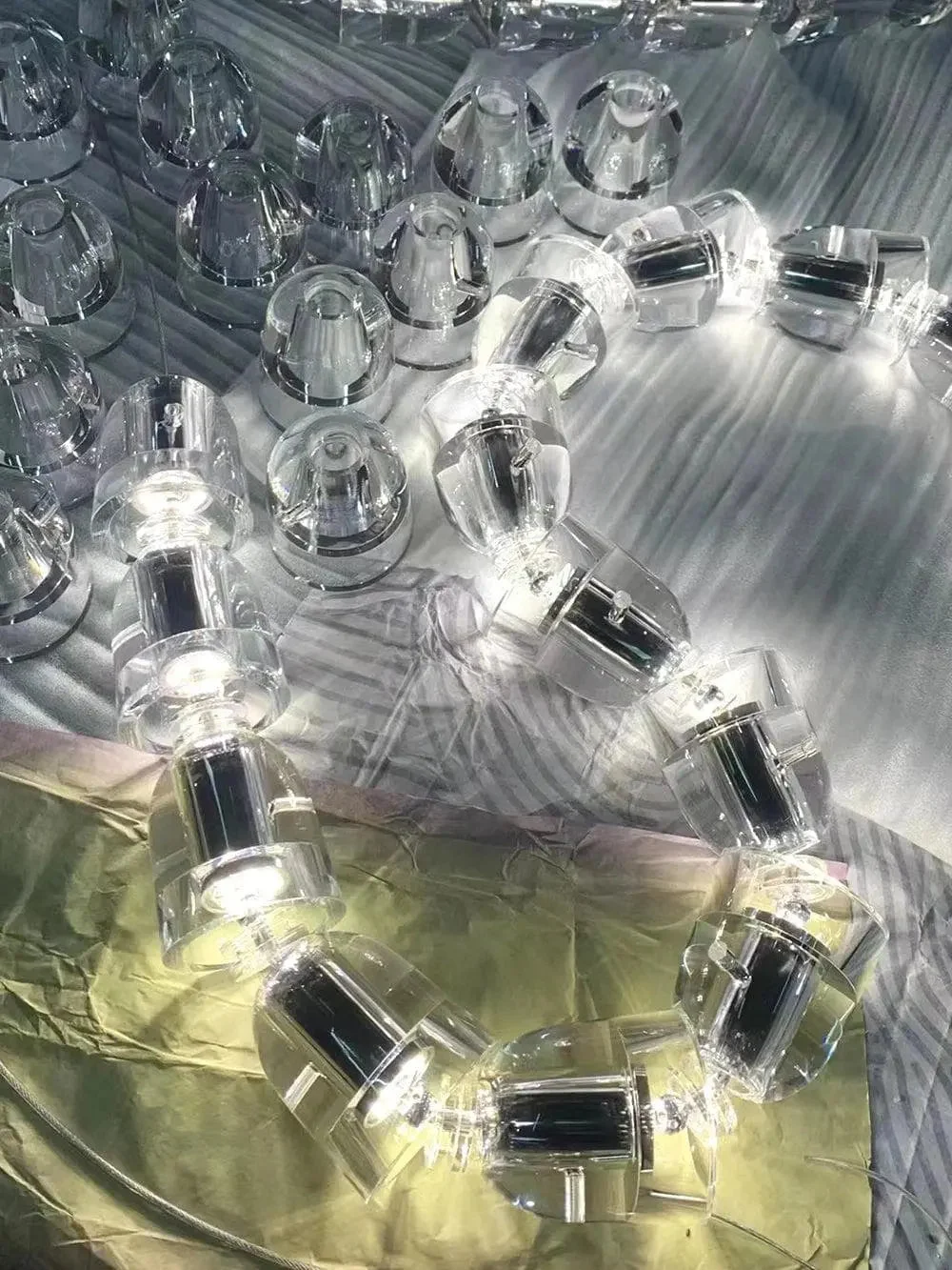 Gabriel Chandelier G delivers a captivating cascade of light that is reminiscent of the fluid charm of a snake. The design features multiple connected thread segments that elegantly converge and diverge to form a V-shaped pendant that evokes the hypnotic movement of a snake. The delicate arrangement of individual elements creates a sense of movement and depth, as if a snake is gently swaying in a mesmerizing rhythm. The fixture’s dramatic vertical drop makes it an eye-catching centerpiece in any room, while the integrated lighting creates a tranquil atmosphere and emphasizes the fixture’s slender elegance. It’s a clever blend of organic inspiration and modern design, perfect for adding a touch of drama to a minimalist or modern decor.