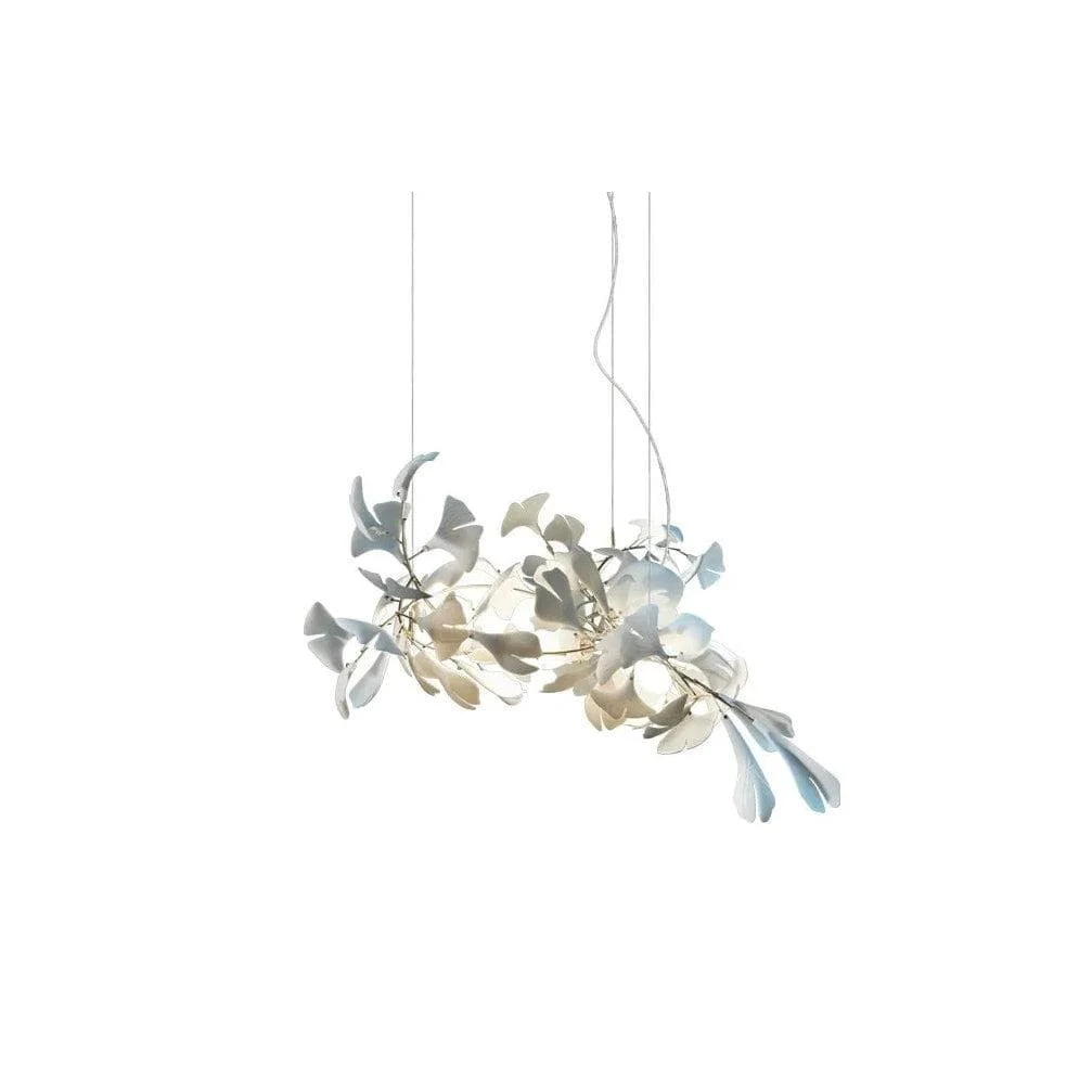 Gingko Chandeliers are impressive bespoke installations, composed of handcrafted porcelain leaves. The interplay between ceramic and light has the power to create a sense of wellbeing and warm atmosphere.