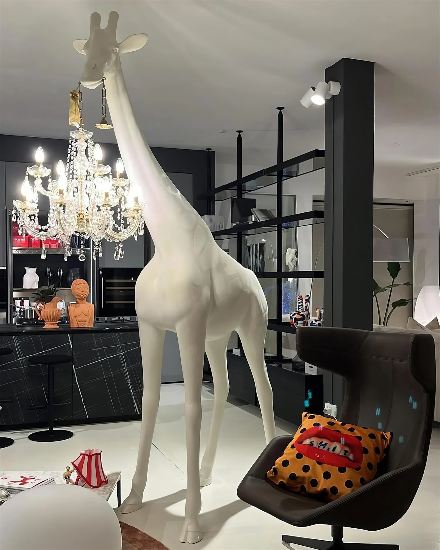 Step into a world where art meets illumination with the Giraffe Sculpture Floor Lamp, featured exclusively on Docos. This remarkable piece showcases a sleek white giraffe, elegantly poised, with a classic chandelier hanging from its mouth. The detailed crystals and glowing candles add a touch of opulence, transforming any room into a sophisticated gallery.