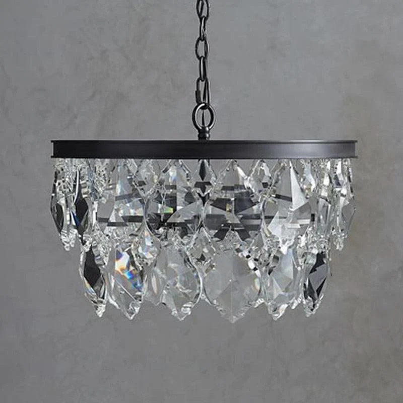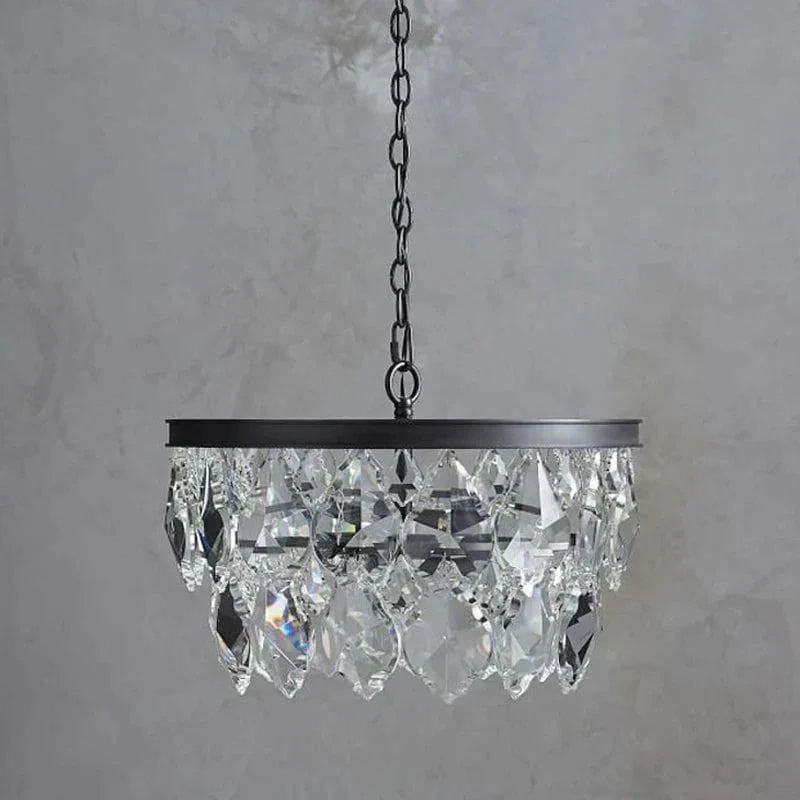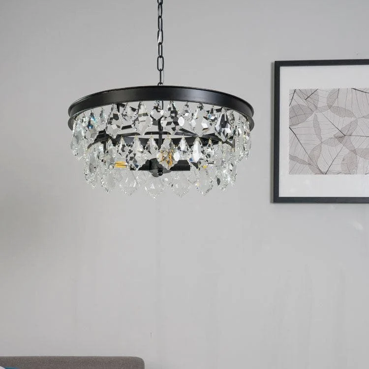 This elegant two-tier chandelier is perfect for any dining room. It is made of crystal and combines traditional and modern styles. Its black finish complements the crystal elements to create a stunning and unique visual aesthetic.