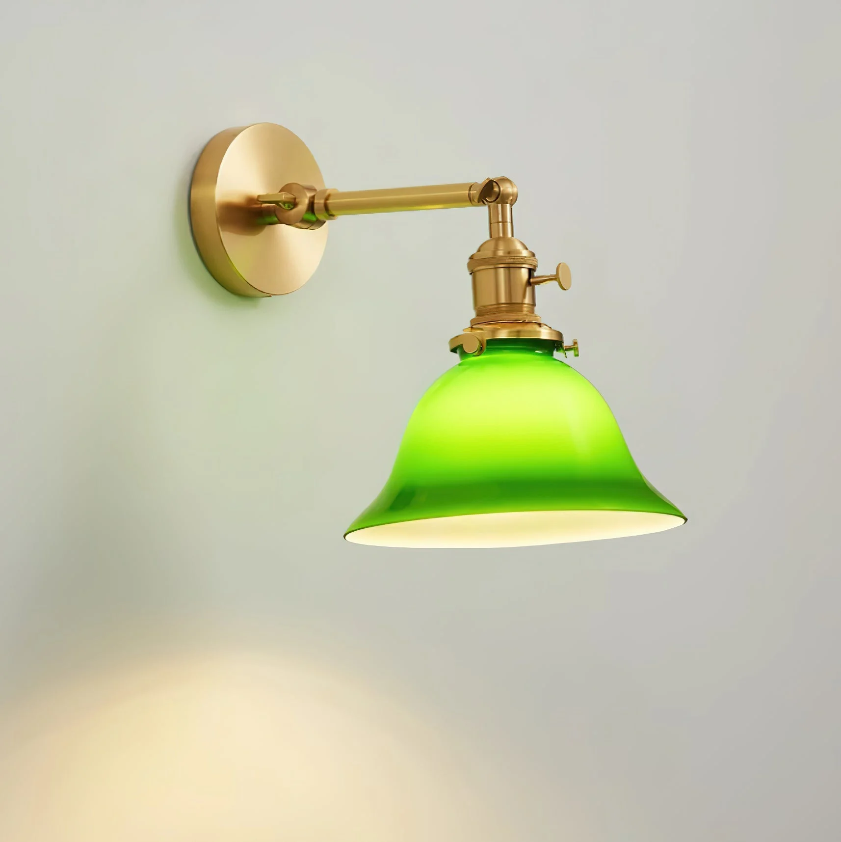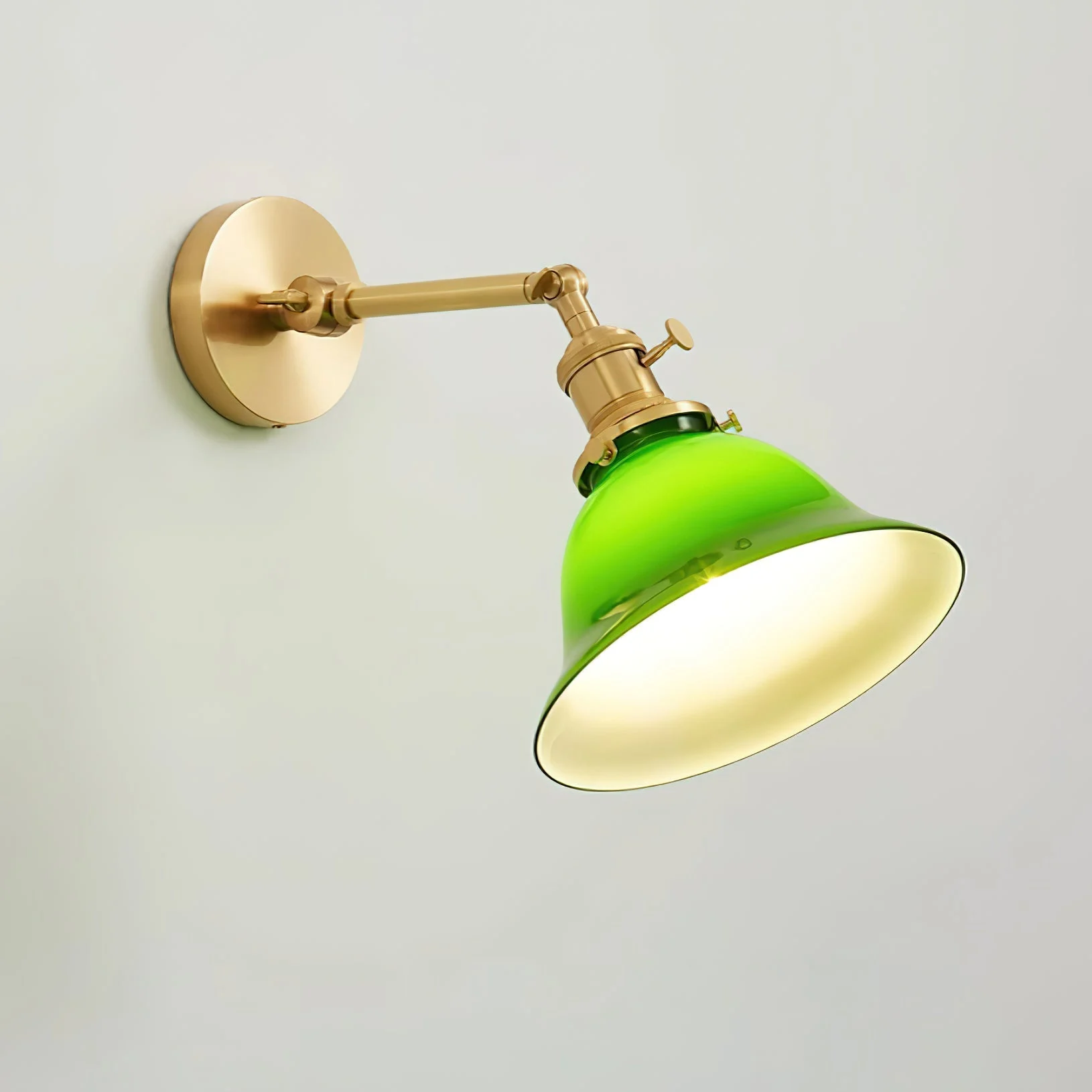 Imbue your environment with the sophistication of the Green Bell Wall Lamp where classic charm meets contemporary flair. Constructed with the finest brass known for its strength and timeless appeal, this wall lamp is a beacon of style and durability. The centrepiece, a luxuriant green glass shade, casts a tranquil yet vivid light, enriching your space with both brightness and a dash of color.