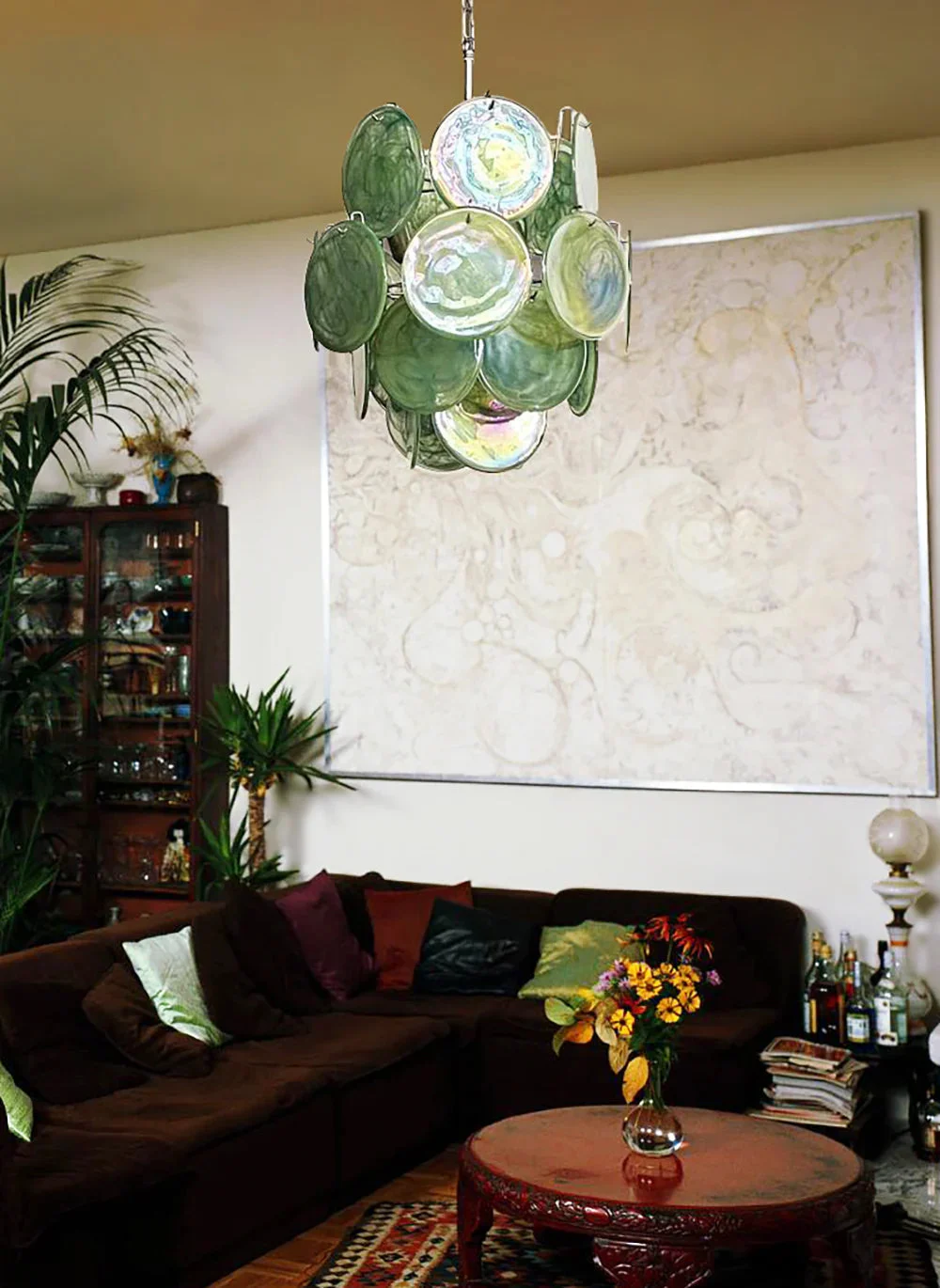 Embrace vintage elegance with our Green Murano Disc Glass Chandelier. This stunning piece adds a touch of charm to any room, serving as a captivating and sophisticated centerpiece. The vibrant pink color and unique design make for a striking visual impact, while the warm glow exudes a welcoming and inviting atmosphere. Elevate your home decor with our Green Murano Disc Glass Chandelier.