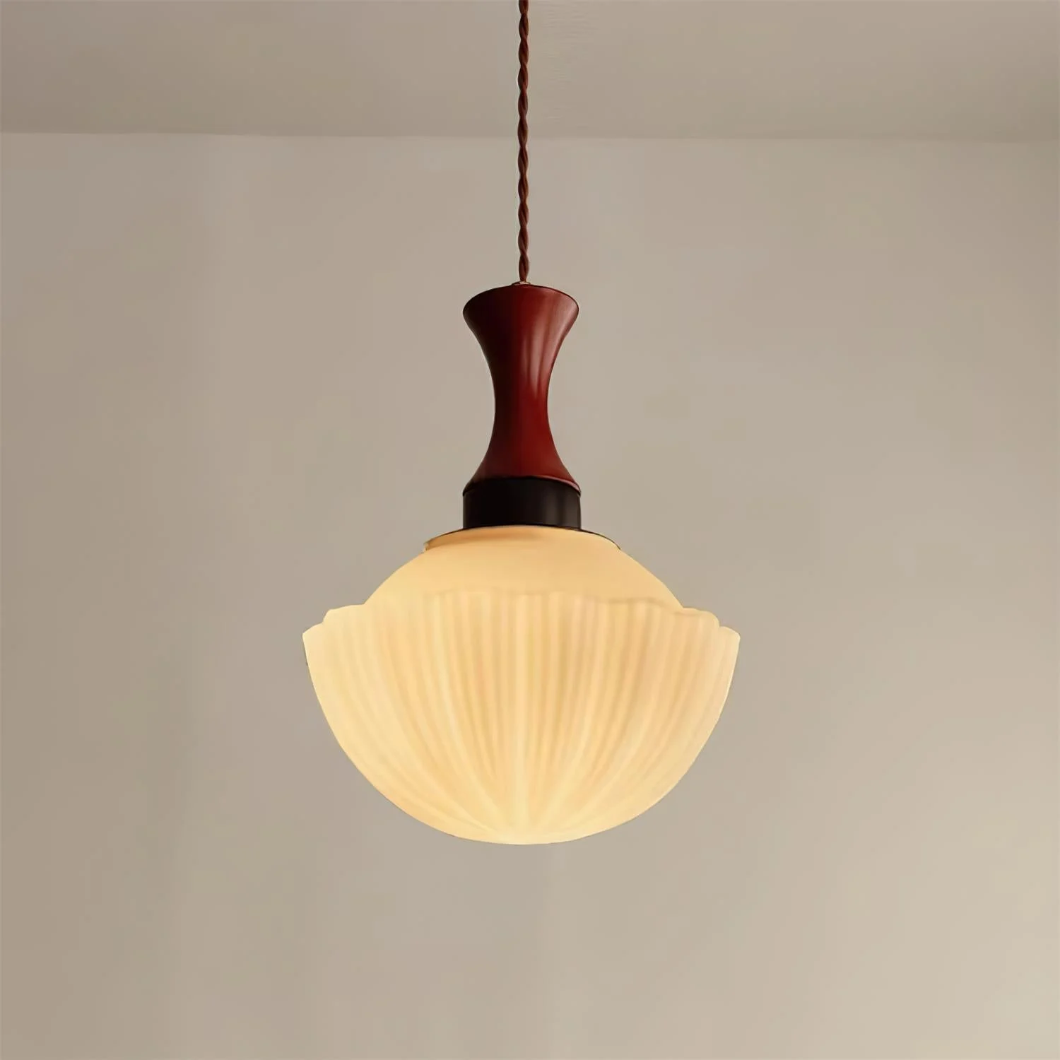 The Greta Pendant Lamp exquisitely marries classic charm with modern sensibility. Featuring a fluted white glass globe that softly diffuses light, it casts a warm, inviting glow. The lamp is elegantly suspended by a sleek, Walnut Color neck that adds a bold pop of color, making this piece a striking focal point.