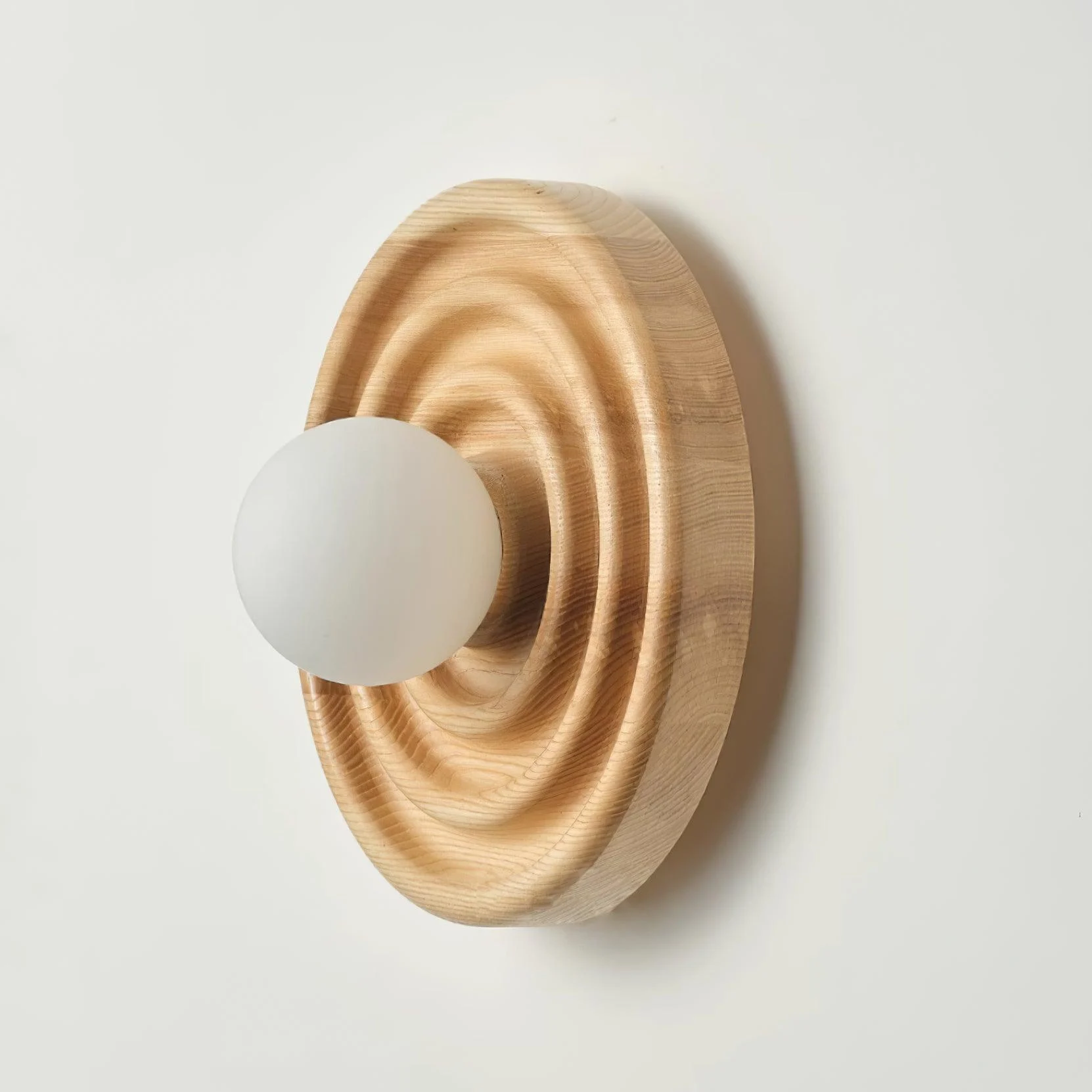 The Grove Wall Lamp an epitome of sculptural finesse and luminary sophistication. This unique wall fixture takes inspiration from the organic swirls found in nature’s groves, crafted into a mesmerizing wooden spiral that draws the eye inward to the warm light at its center.