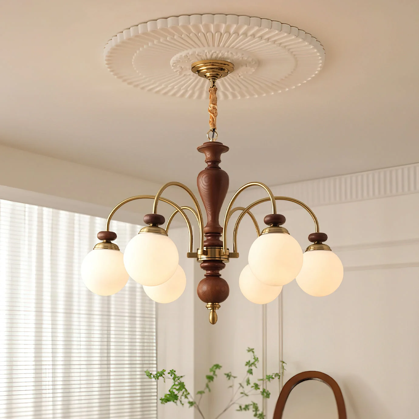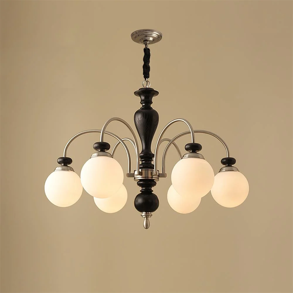Embrace timeless elegance with the Guillerme Classic Wooden Chandelier. This sophisticated fixture features a beautifully sculpted wooden centerpiece, enhanced by a series of graceful metal arms that extend to support opal glass globes. The combination of rich wood tones and the soft sheen of metal provides a versatile look that complements both traditional and contemporary decors.