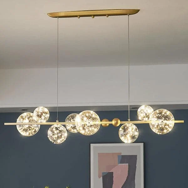 The delicate hand-blown glass bulbs with decorative string lights inside are arranged around a ring or along a bar. This is similar to how DNA sequences are wrapped by nucleosomes to form a chromosome.