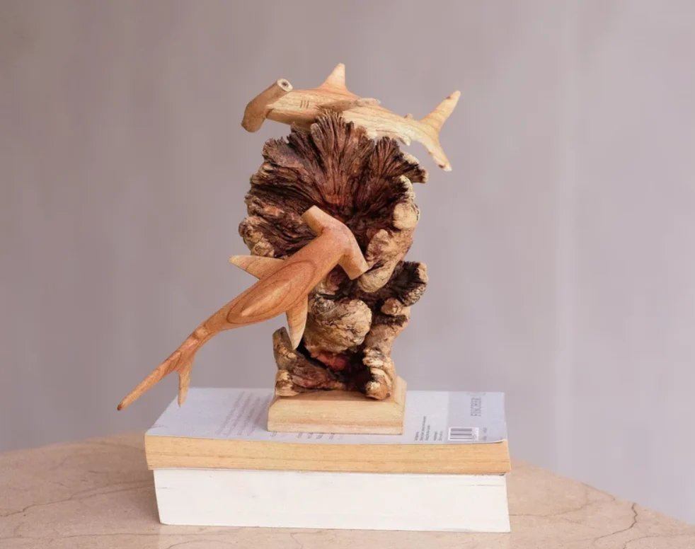 Shark is made from local wood, Jempinis wood. Part of the base of this statue is made of Parasite wood. Parasite wood is a very unique type of wood.