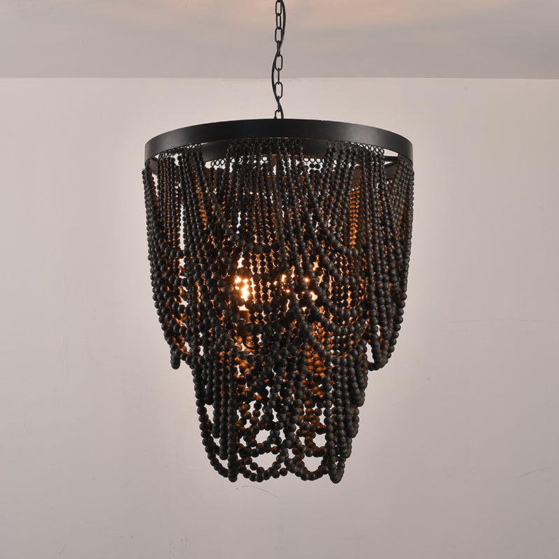 Offer an exotic upgrade to a living or dining space. Looped wood beads in a white finish add a fun touch and produce intriguing lighting effects. This large tinted raw iron and wood pendant stands out as an artful and interesting fixture.