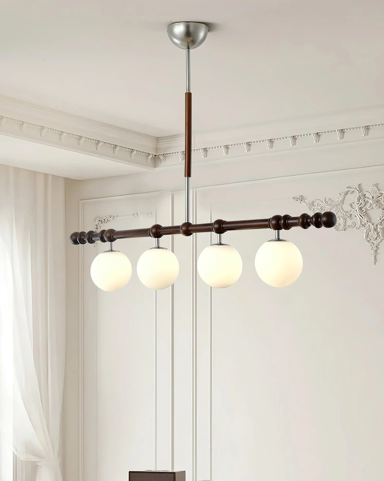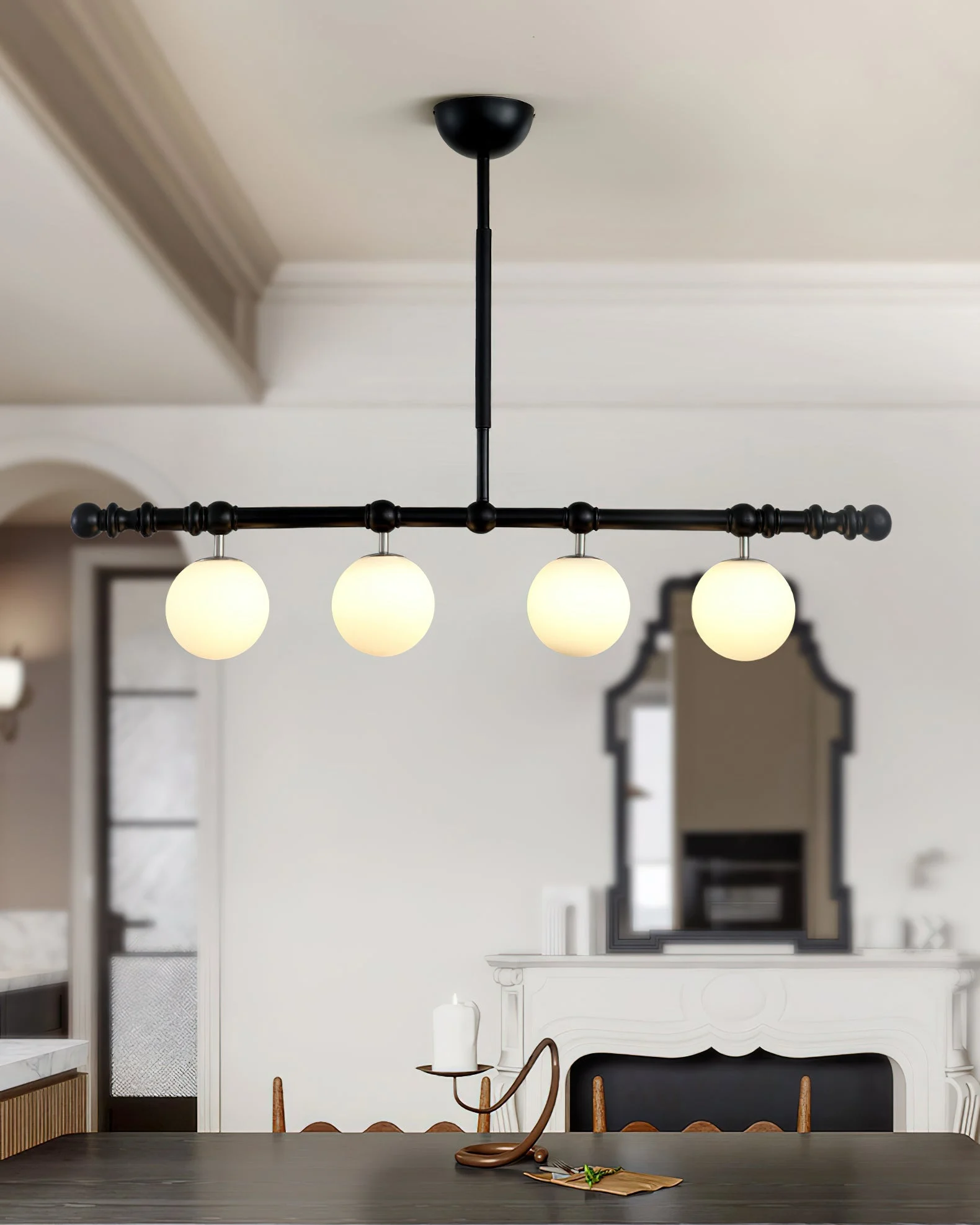 This exquisite fixture embodies timeless sophistication with a modern twist, offering a unique aesthetic that enhances any space. Crafted with meticulous attention to detail, the Hayes Chandelier features a sleek, elongated frame adorned with smooth, spherical accents. The linear arrangement of its opal glass globes not only disperses a warm, inviting glow but also adds an element of contemporary chic to its classic design.