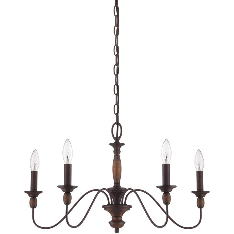 This 8-light chandelier brings traditional style to your dining room, living room, or bedroom. It’s made from metal with a wood color finish and features a turned central down rod, and eight curved arms for a classic silhouette. At the end of each arm, there is a candelabra base with a candle bulb (not included) that illuminates your space with a soft glow.