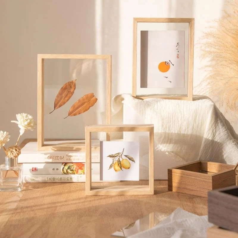 - This double-sided glass transparent picture frame fully considers your needs as engrave logo is allowed. Woodgrain veneer is integrated with double-sided visible glass, which is simple and beautiful. It can hold articles with a size of less than 2 mm, convenient and durable. Whether it’s a desk, a window sill, or a little comer, don’t forget to leave it a seat. The handwork is more realistic.