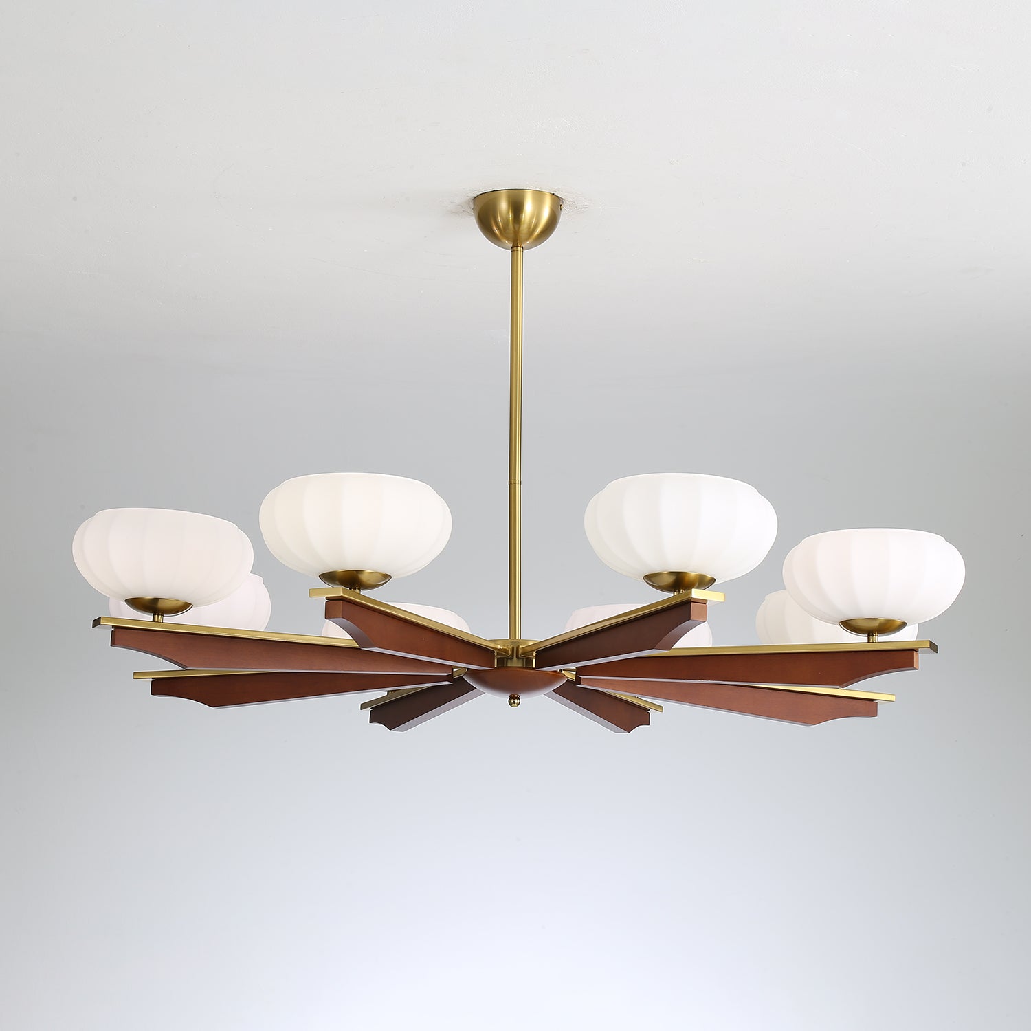 The Imperium Chandelier by Homelova is a statement piece that blends timeless craftsmanship with modern elegance. Crafted with glass, iron, and wood, this chandelier embodies regal sophistication. Its sculpted glass shades, reminiscent of delicate lanterns, diffuse a soft and ambient glow, while the sleek iron framework provides durability and structure. The warm wooden elements introduce an organic touch, making it a perfect addition to dining rooms, living spaces, and grand foyers. With its balanced design and luminous presence, the Imperium Chandelier transforms any space into a realm of refined luxury.