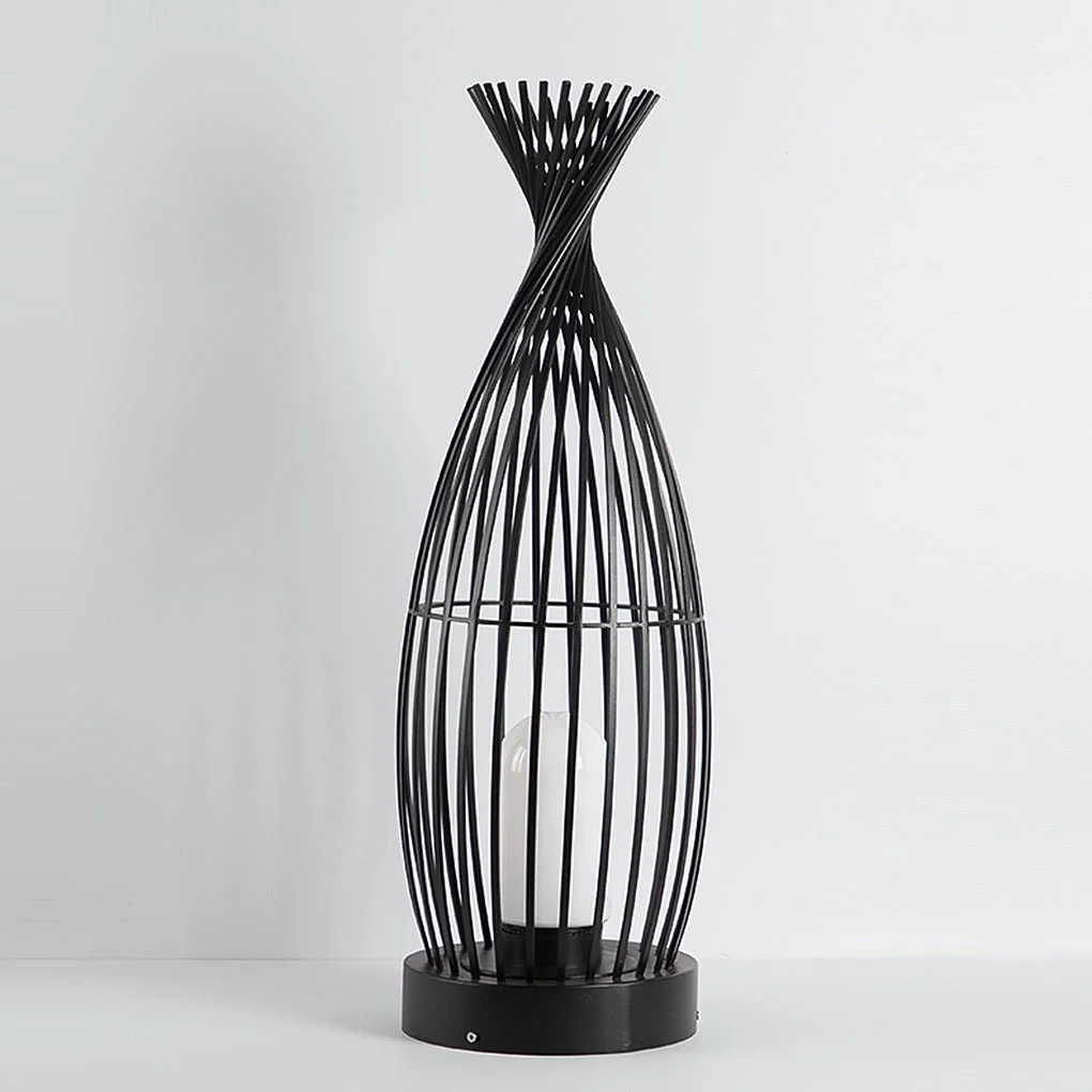 The lamp features a slender, curve, protective column in bottle shape and black metal finish. The caged column extends upwards from a cylinder-shaped pedestal at the bottom. Inside LED accent lamp give high light transmission, while the outside caged metal is safe to use against water and dust.