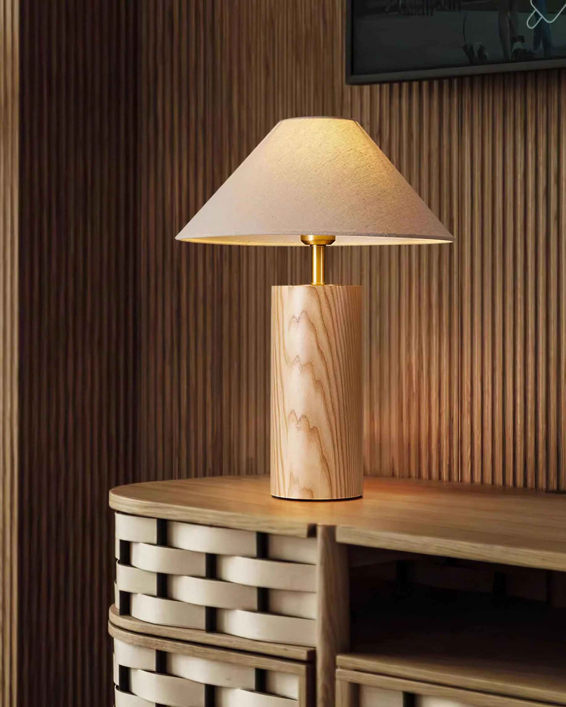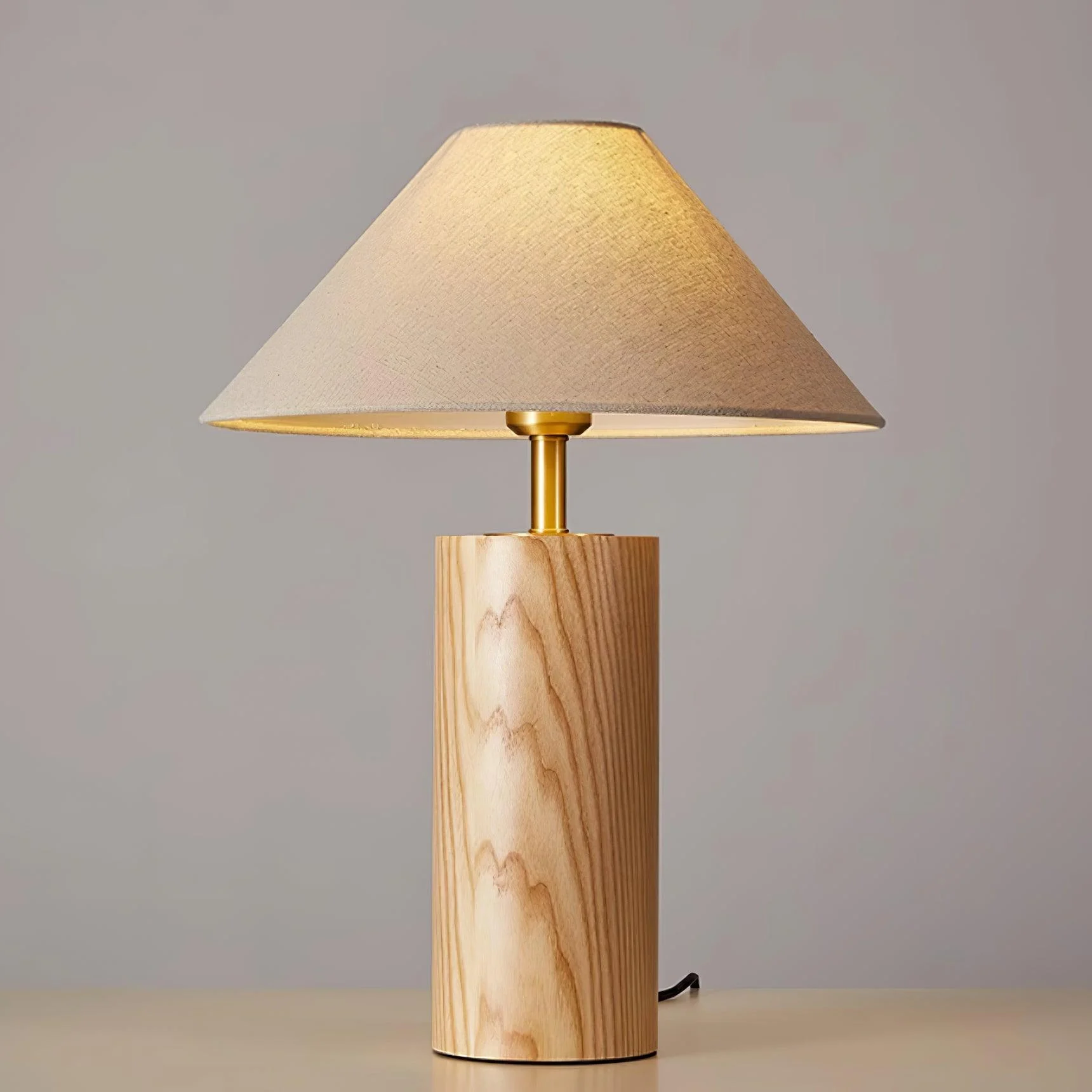 The James Table Lamp, with its splendid walnut and natural wood options, exudes a serene confidence that perfectly complements any interior. It stands poised, a cylindrical base of finely grained wood, leading to an elegant brass neck that culminates in a classic lampshade. Its broad shade, in a textured beige fabric, casts a warm, inviting glow, illuminating your space with a soft, ambient light that speaks of home and comfort.