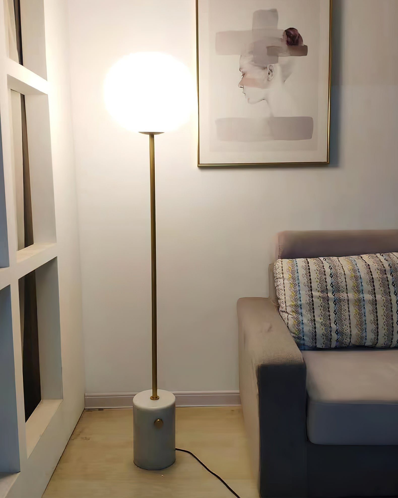 Inspired by traditional oil lamps. Crafted from contrasting materials, the elegant yet bold design is a lesson in refinement and a study in geometry. An elliptical white glass shade, a slender metal stem, and a rectangular marble base fitted with a come together to create this timeless addition to modern spaces.