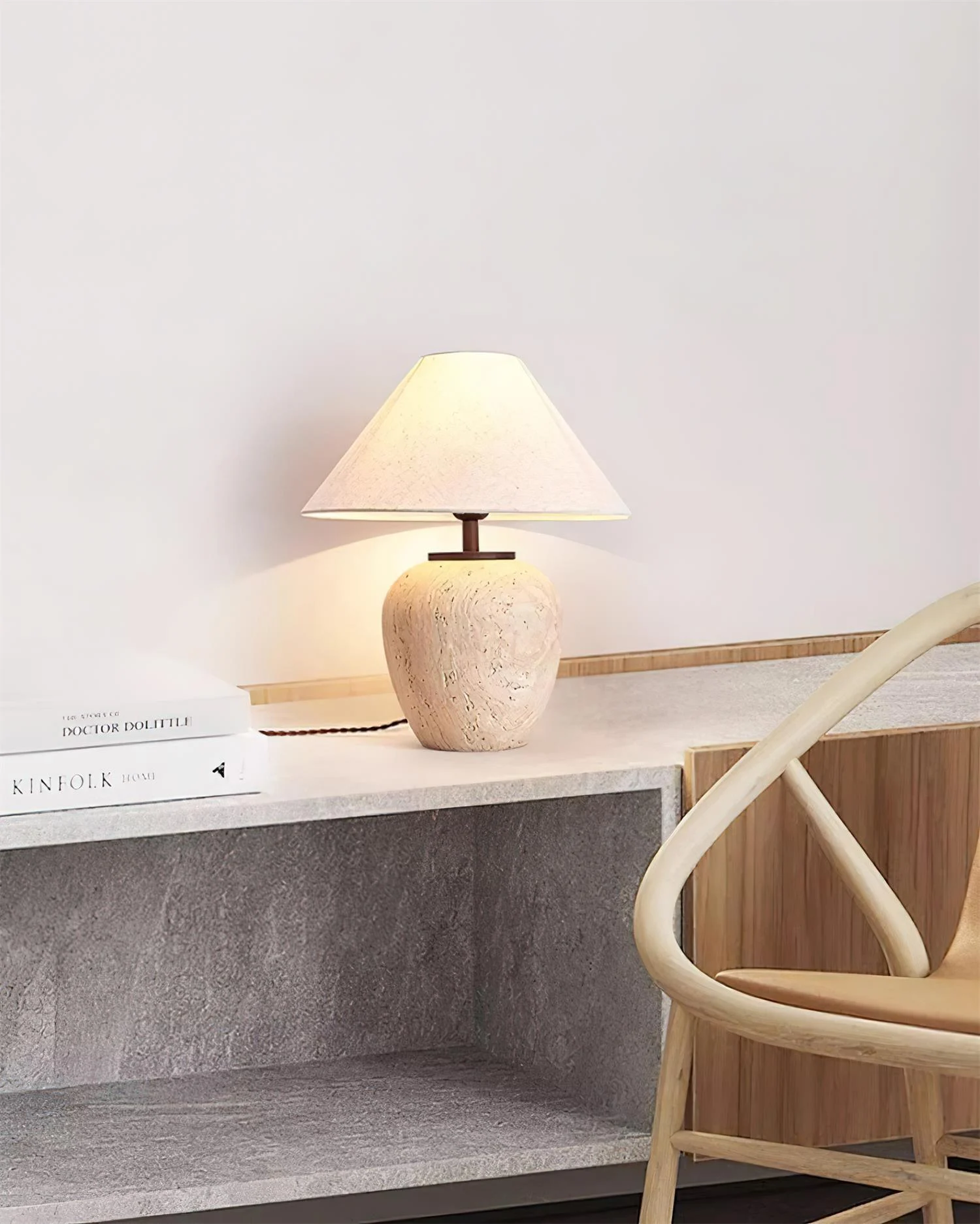 The Kaliyu table lamp with its rugged natural design aesthetic and soft lighting effect, adds a touch of warmth to any room. The yellow travertine base is crafted from natural materials, with an irregular surface texture that complements its primal beauty, reflecting the true charm of artisan craftsmanship. Paired with the lampshade, it has a white base color adorned with subtle crack patterns, echoing the base’s rustic nature.