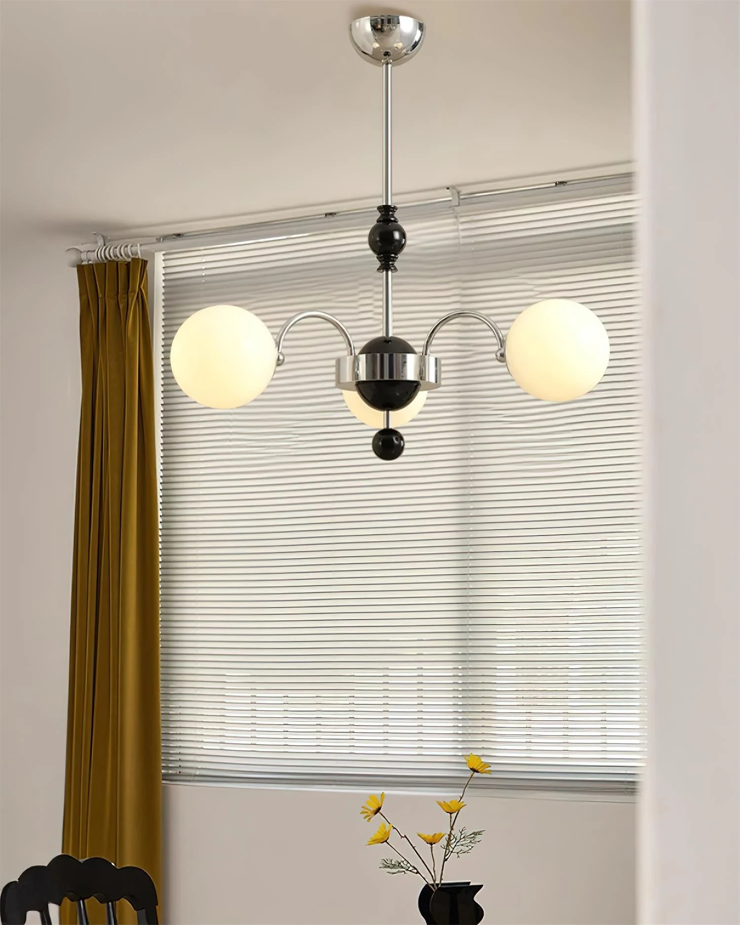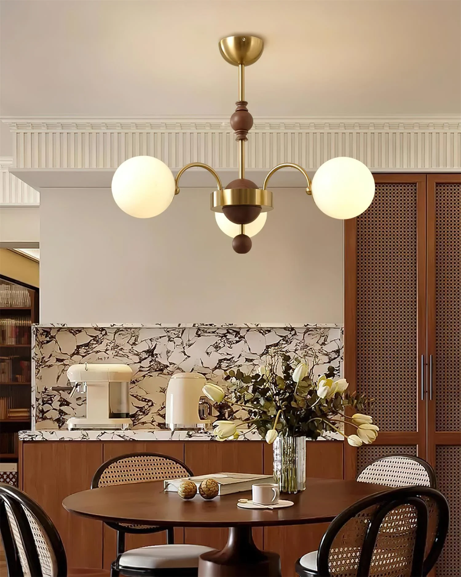 This vintage-style Kanth Chandelier beautifully blends elegant Metal with warm wooden elements, exuding a unique retro charm. The opal glass shades resemble classic radiance flowing softly through the space, casting a warm and gentle glow. The simple arched arms perfectly combine vintage aesthetics with modern sensibility, preserving timeless beauty while adding a distinct touch of sophistication to your interior.