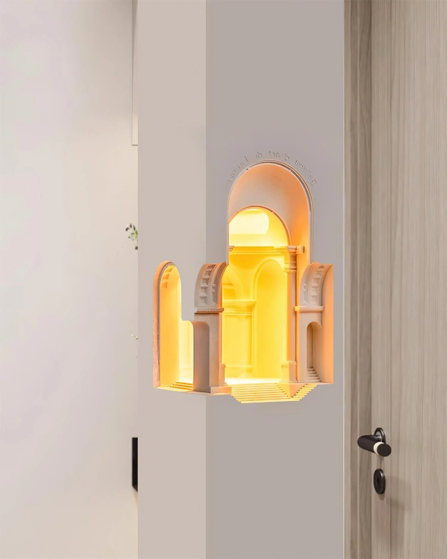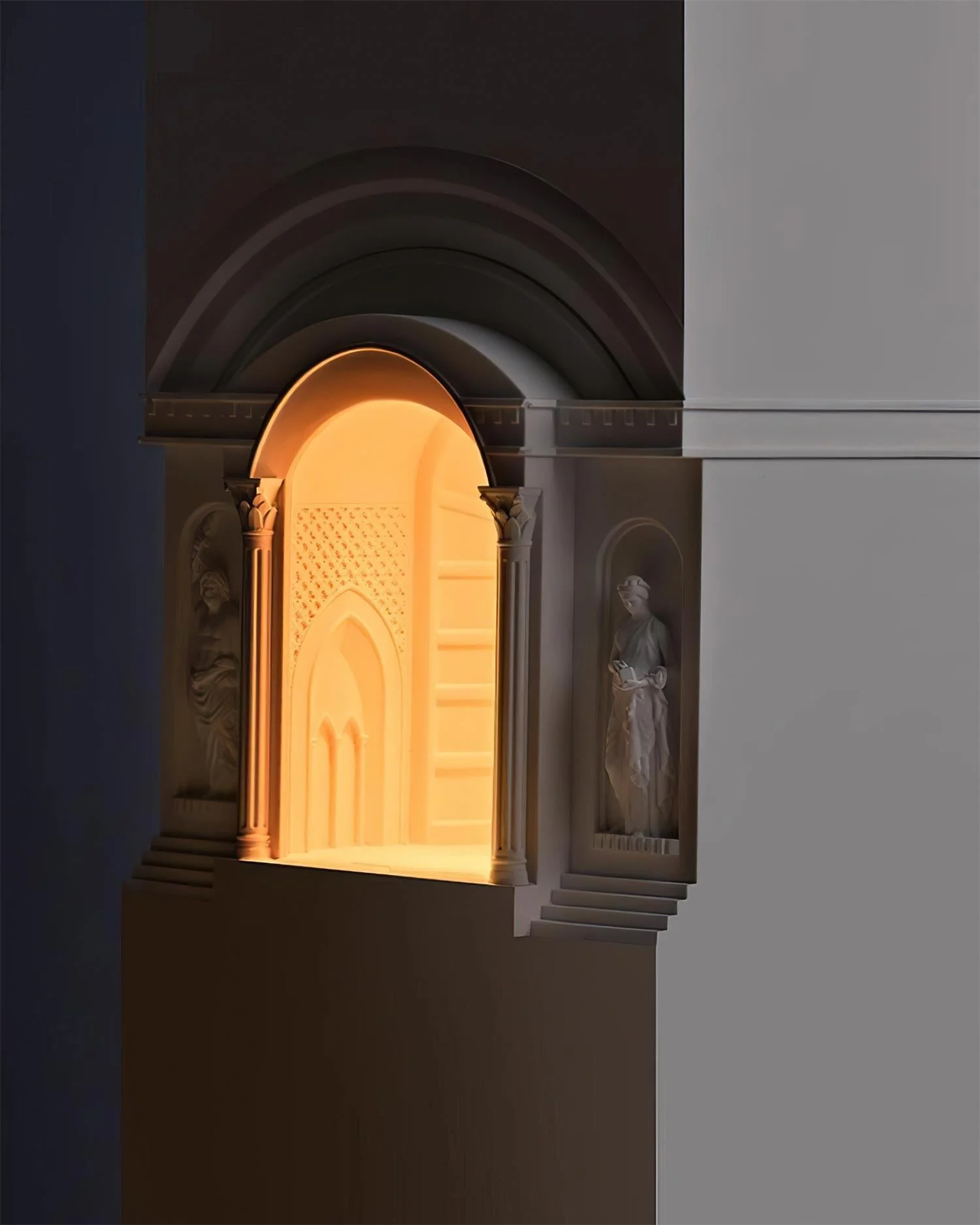 This unique lamp features a beautifully sculpted, classical architecture-inspired design with layers of arches and a central statue, creating a serene and sacred ambiance. can also be seamlessly integrated into a wall as a decorative fixture.
