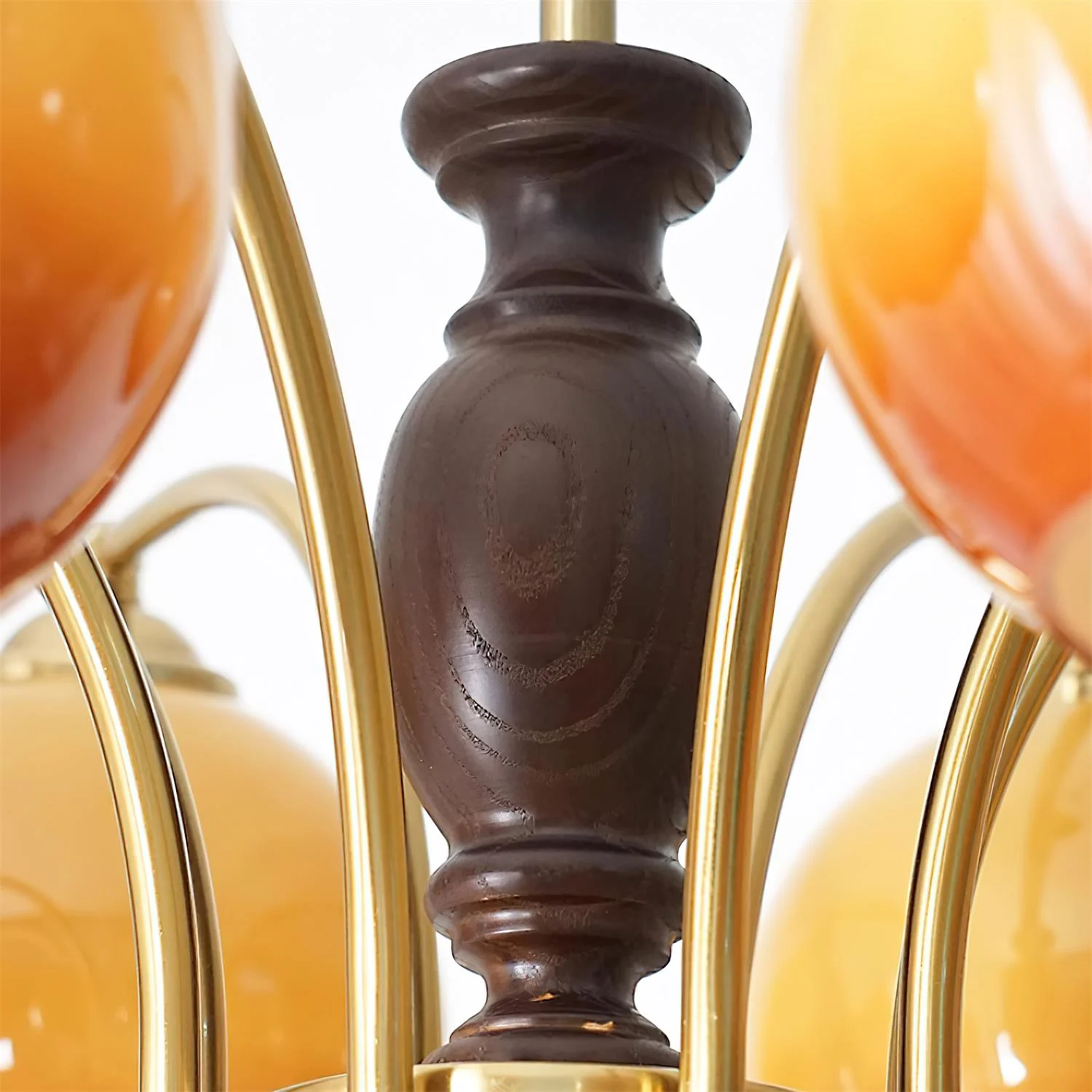 Elevate your interior with the sophisticated Keston Chandelier, a masterpiece of design that seamlessly blends glass, wood, and metal materials. Each of the chandelier’s elegant arms holds a beautifully crafted glass shade, featuring a stunning gradient that transitions from a rich caramel colour to a warm golden hue. The wooden elements provide a touch of organic warmth, while the metal framework adds a sleek and modern touch.
