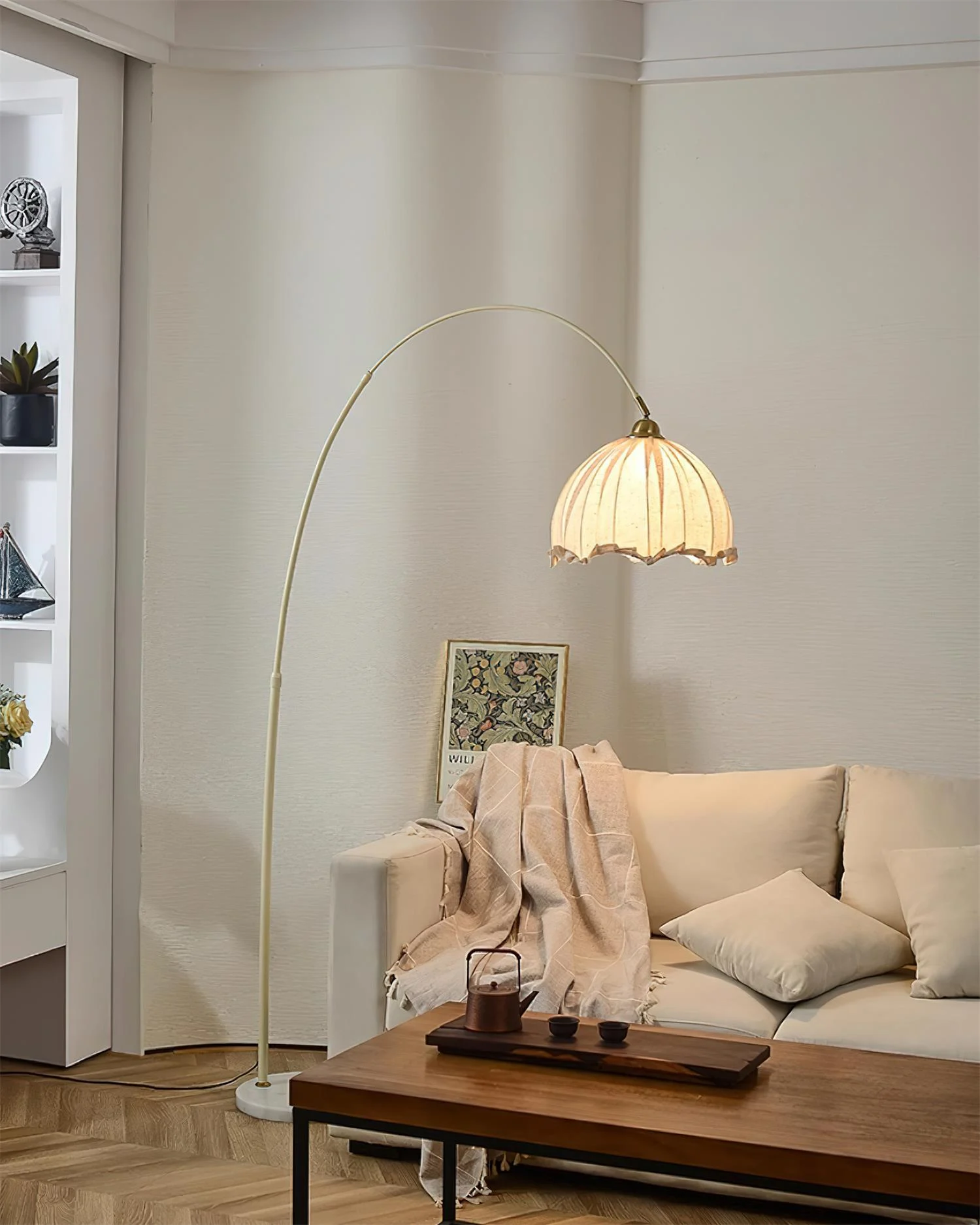 Meet the “Kimala Floor Lamp” from Docos, a blend of sculptural artistry and functional elegance. This floor lamp features a dramatic arch that gracefully extends over living spaces, culminating in a beautifully crafted Fabric shade with a delicate, The design is anchored by a robust black base that ensures stability while maintaining a sleek silhouette. Perfect for a reading corner, beside a sofa, or as a standalone feature in a minimalist room, the Kimala Lamp is not just a source of light but a statement piece that enhances the visual interest and ambiance of any modern home.