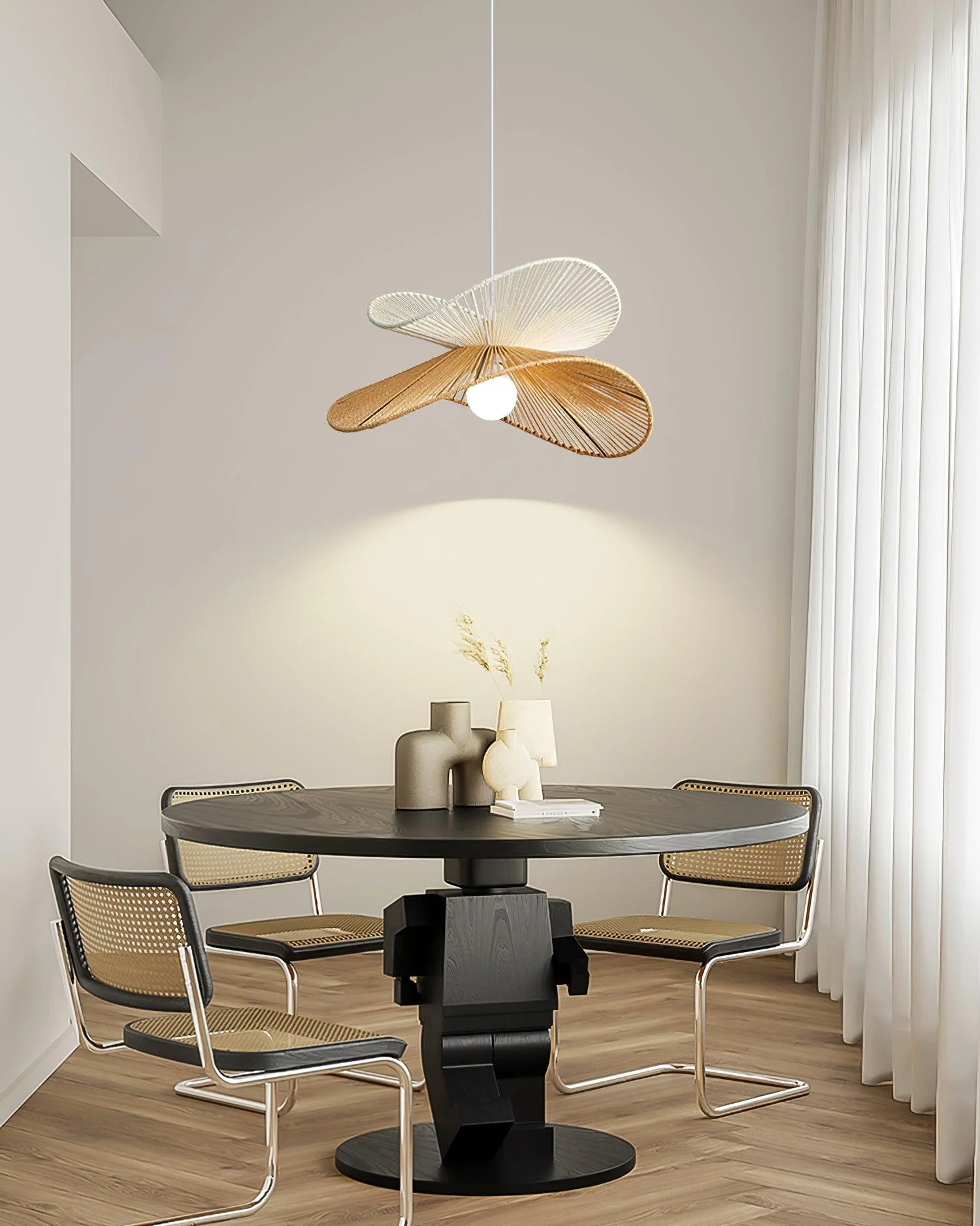 The Kiriana Pendant Lamp is the perfect piece to add sophistication and elegance to any space. Crafted with a delicate Japanese-style motif and hand woven shade, this pendant offers a touch of finesse. Light up your home with this unique and exquisite design.