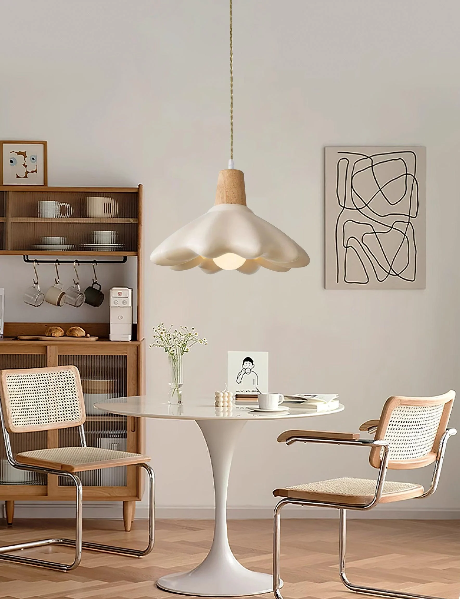 The Kora Resin Pendant Light gently infuses your home with its soft curves and natural color palette. Made from high-quality resin and complemented by a natural wood element at the top, it offers a light and cozy aesthetic. The design seems inspired by the gentle caress of ocean waves, with its wavy lampshade edges softening the light to emit a gentle and comfortable glow.