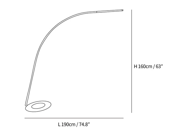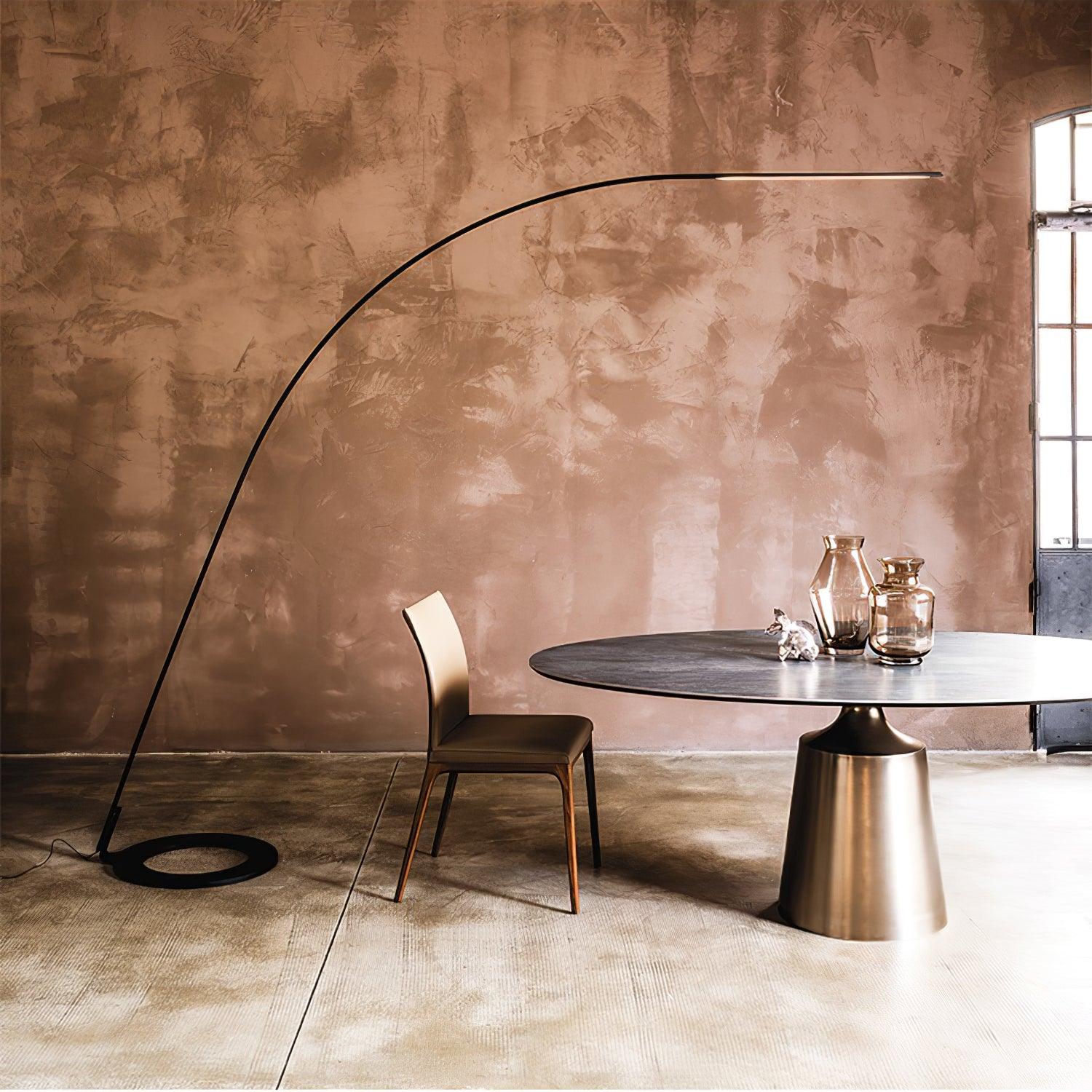 The Lampo Floor Lamp combines modern design with iconic inspiration. A fine steel wire, anchored by a minimal round base, provides simultaneous lightness and flair. Elevate your living room with this contemporary arc lamp