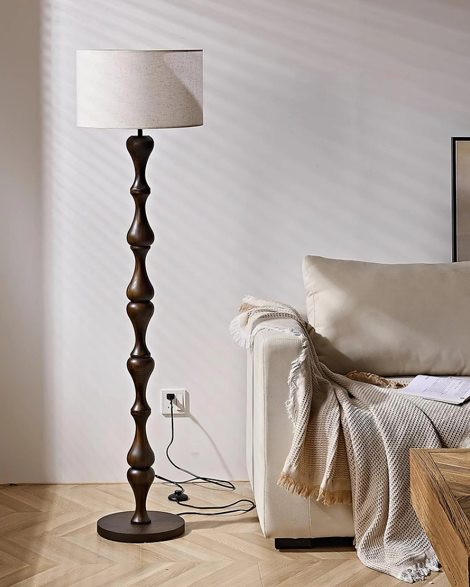 This vintage inspired floor lamp combines classic elegance with modern functionality to bring a touch of sophistication to your home. Crafted with a solid wood gourd-shaped pillar, this lamp exudes a rustic yet refined appeal, Its fabric lampshade allows a gentle, diffused glow to fill your room, creating a cozy and inviting atmosphere. It’s a vertical decorative masterpiece that stands tall beside your sofa, making it the perfect addition to your living space.