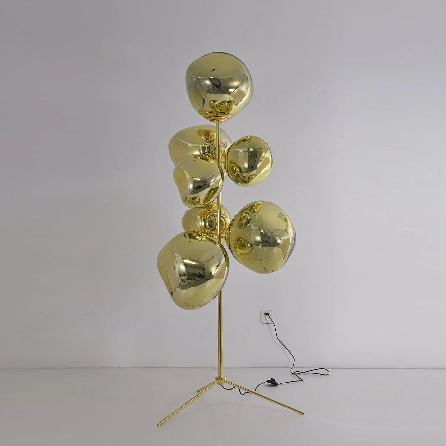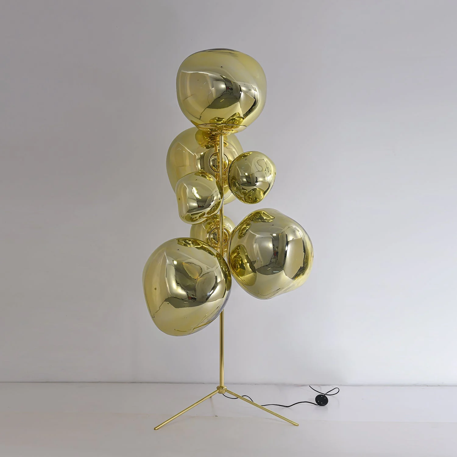 The Lava Stand Floor Lamp, a luxurious piece of modern art that is sure to captivate guests and define any space. This exquisite chandelier features three Lava Mini shades and four Lava shades encased in a stunning gold finish. When lit, the light creates a mesmerizing melting hot-blown glass effect and when off, the mirror-finish effect is sure to spark conversation.