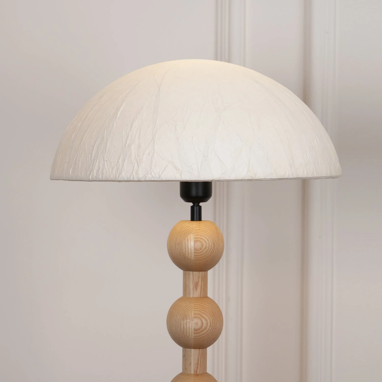 The Lavin Floor Lamp elegantly combines rustic charm with contemporary minimalism. Its standout feature, a vertical stack of wooden beads, exudes a playful yet sophisticated aesthetic, punctuated by the organic beauty of natural wood. Atop this sculptural base sits a subtly textured, Rice paper dome-shaped fabric shade that diffuses light softly, This lamp is perfect for adding a touch of artistic flair and serenity to any living space, making it ideal for rooms designed with comfort and style in mind.