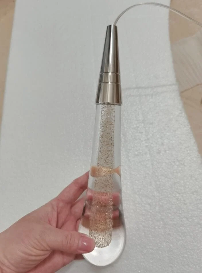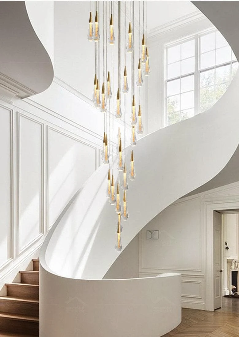 The centerpiece of this LED Glass Drops Chandelier is the artisan blown glass, which mimics the shape and translucency of raindrops. The glass is carefully crafted to achieve a thick and substantial look, adding to the overall aesthetic of the piece. The metalwork complements the glass elements.