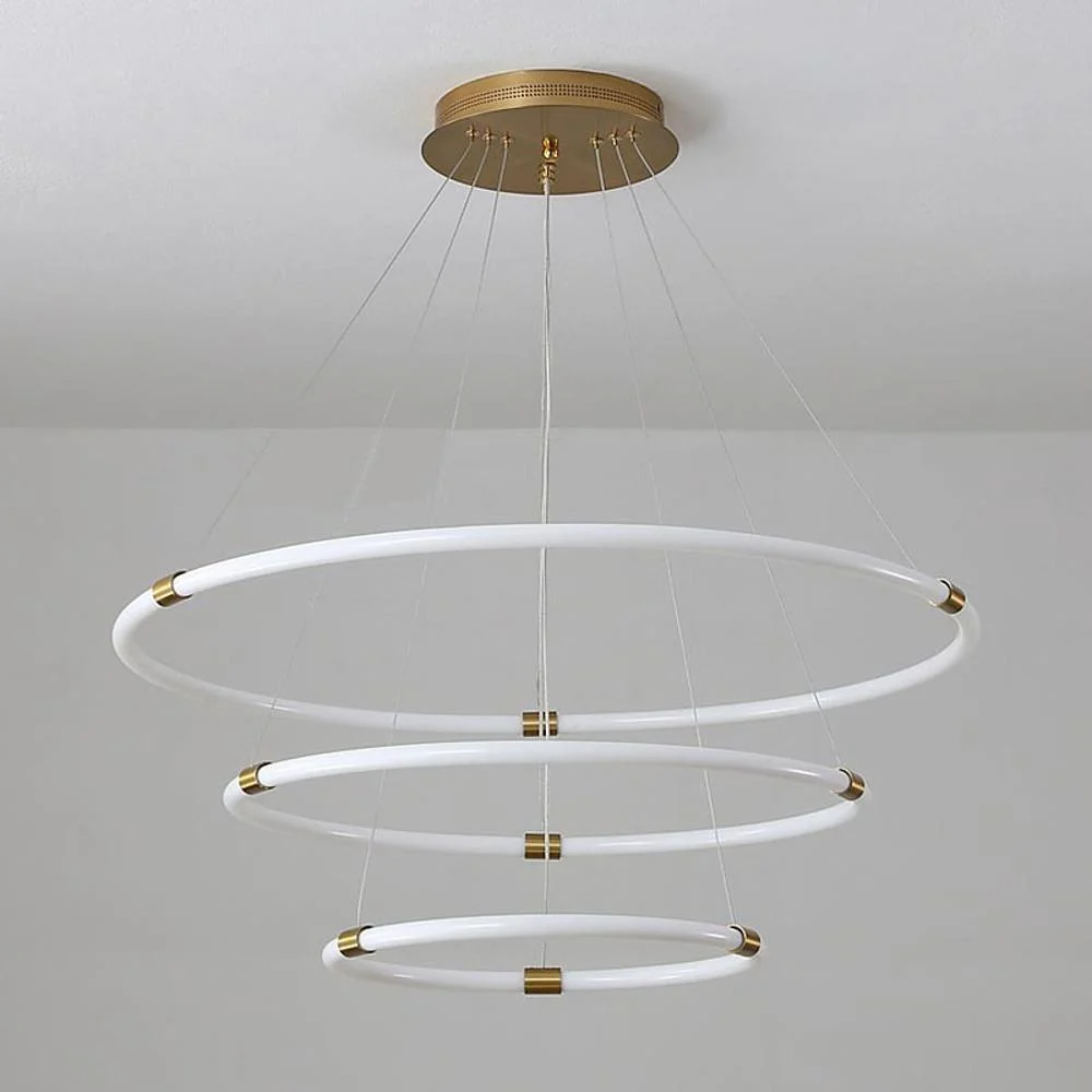 This Surrounding design Circle LED Chandelier resembles a set of three large, smooth rings, each one floating at a different angle and height, creating a layered effect. These rings are like thin, circular hoops, each suspended in mid-air. Each ring is connected to the ceiling with thin wires and these wires are attached to small, gold-colored brackets.